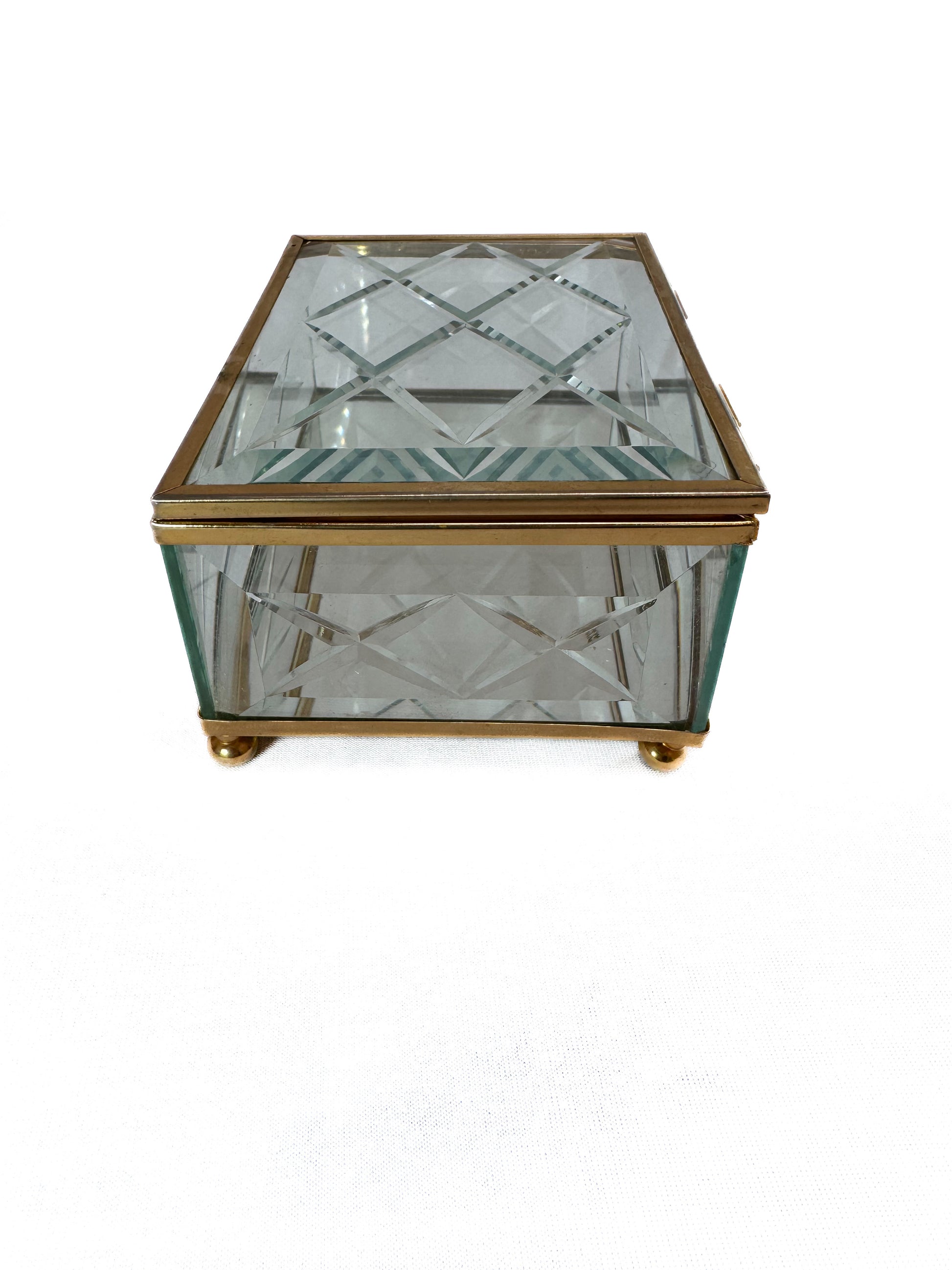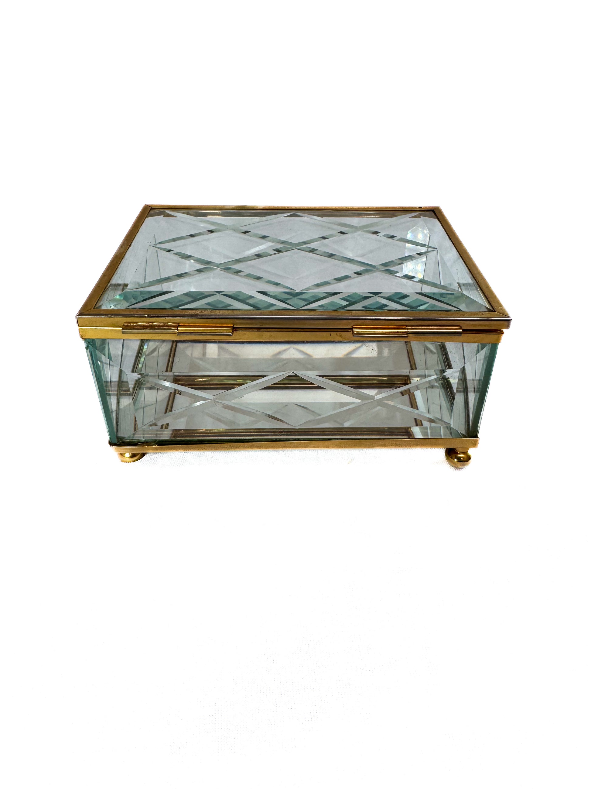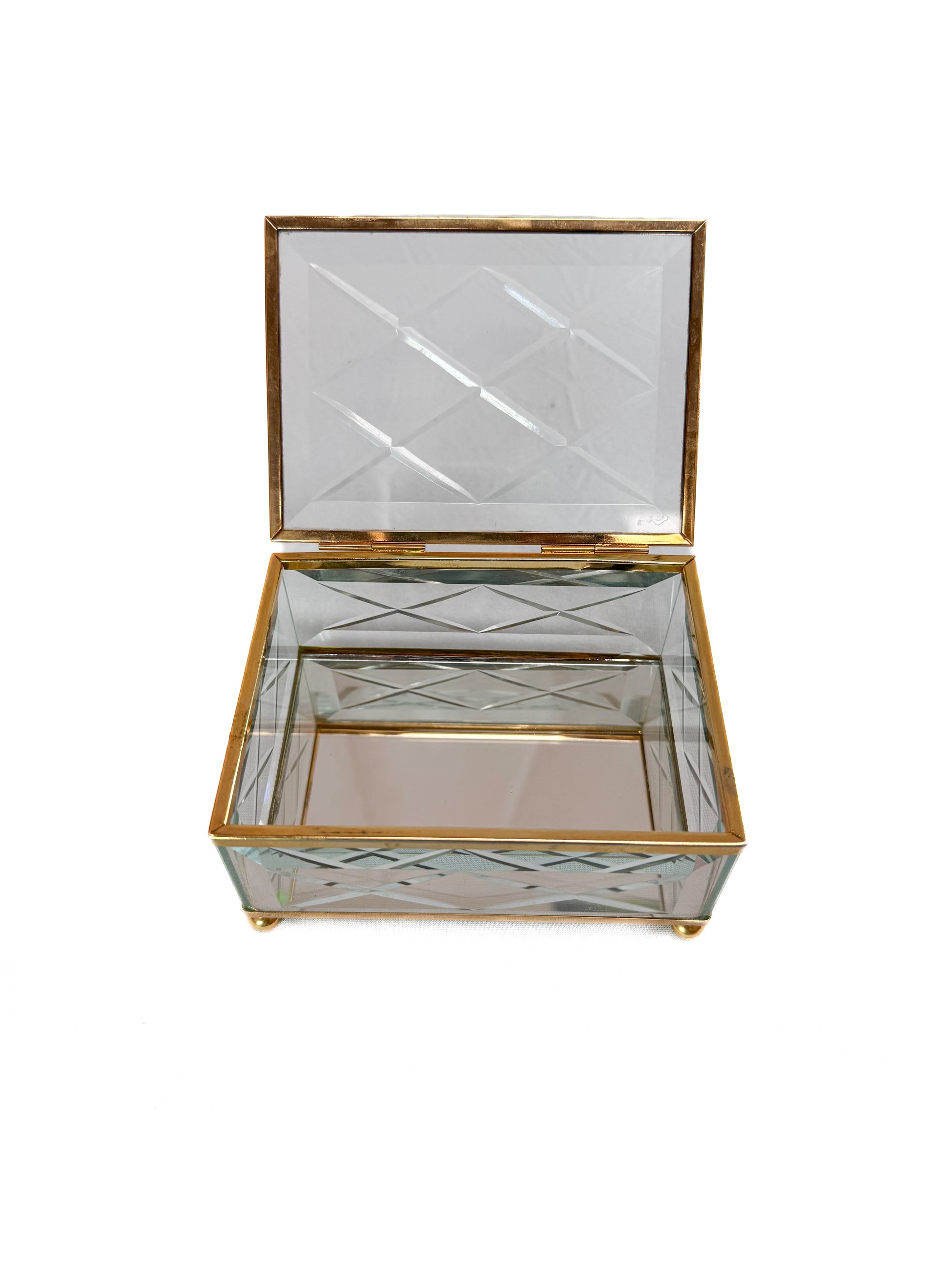 Vintage Jewelry Box - Pillow Cut Beveled Glass - Mirrored Bottom - Brass Feet