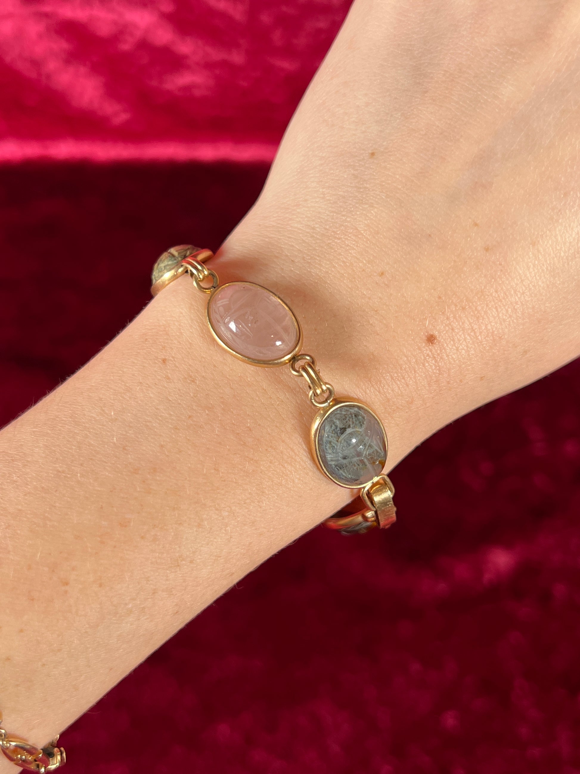 Vintage Jewelry - Bracelet - Gold Tone - Multicolor Carved Scarab Beetles - Krementz - 7"