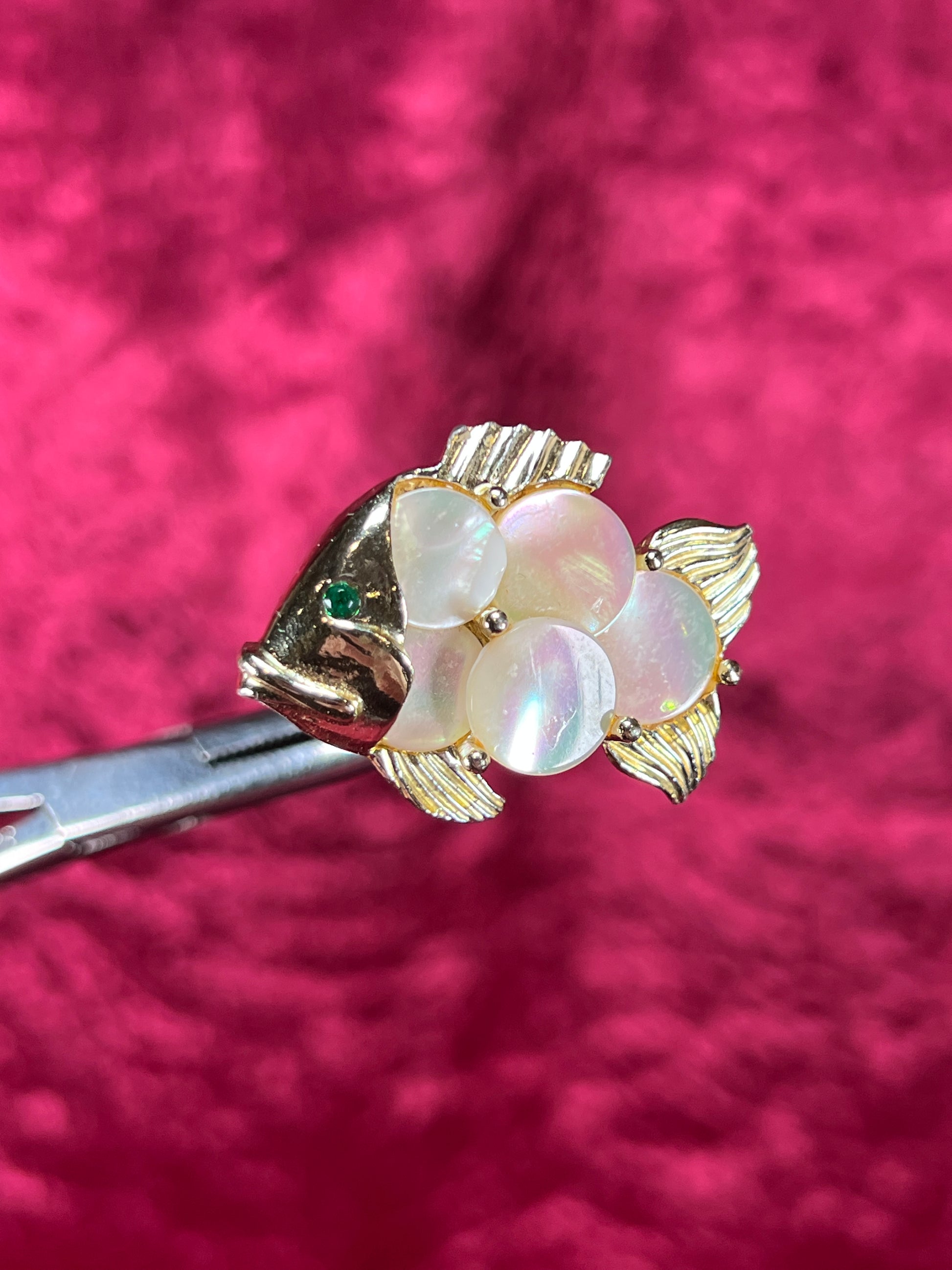 Vintage Jewelry - Brooch - Gold Tone Fish - Green Rhinestone Eye - Mother of Pearl Scales