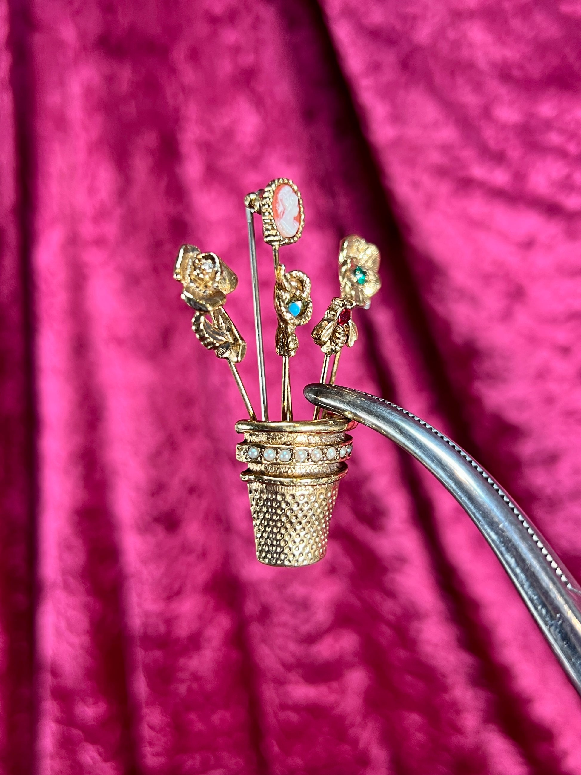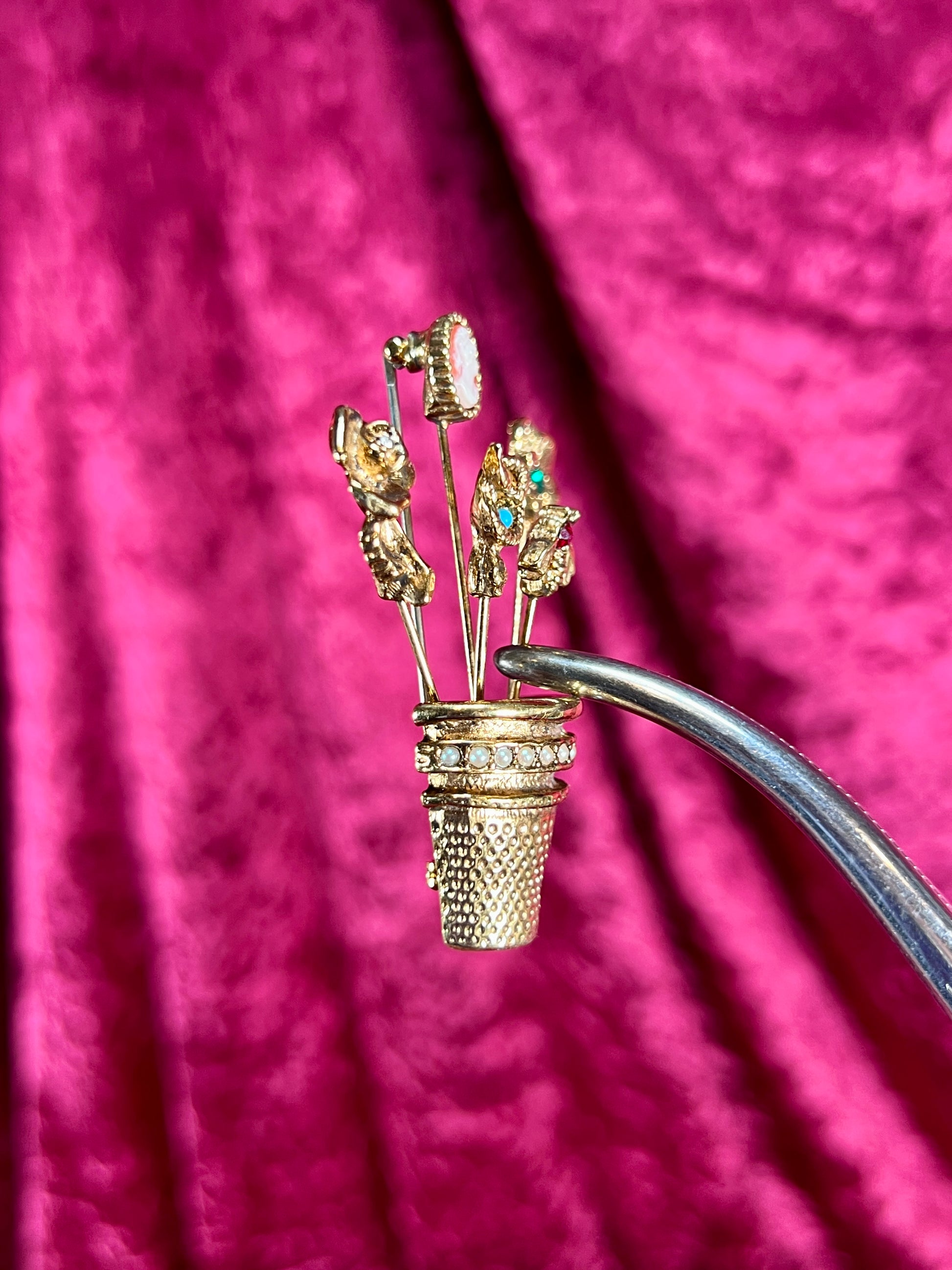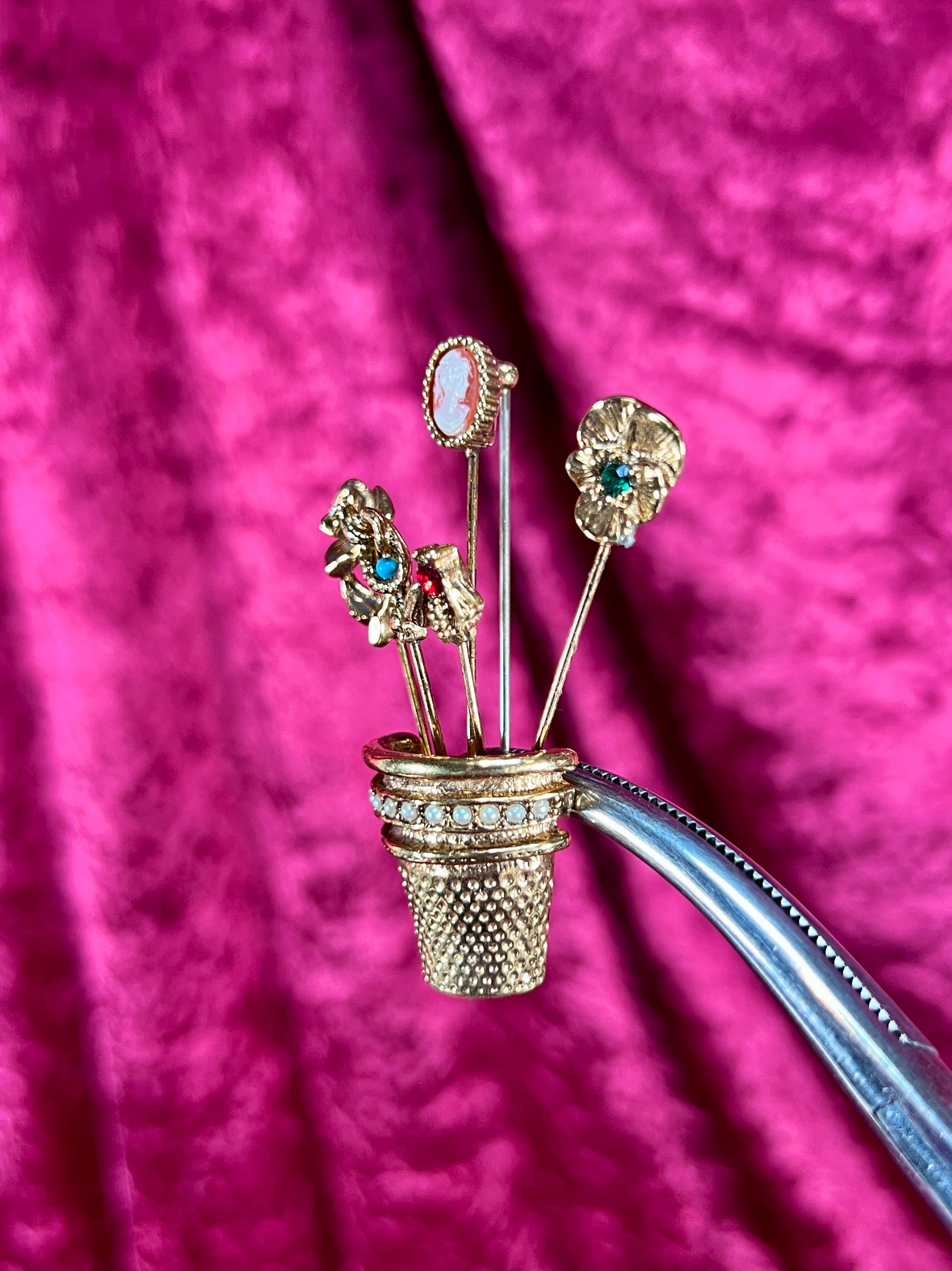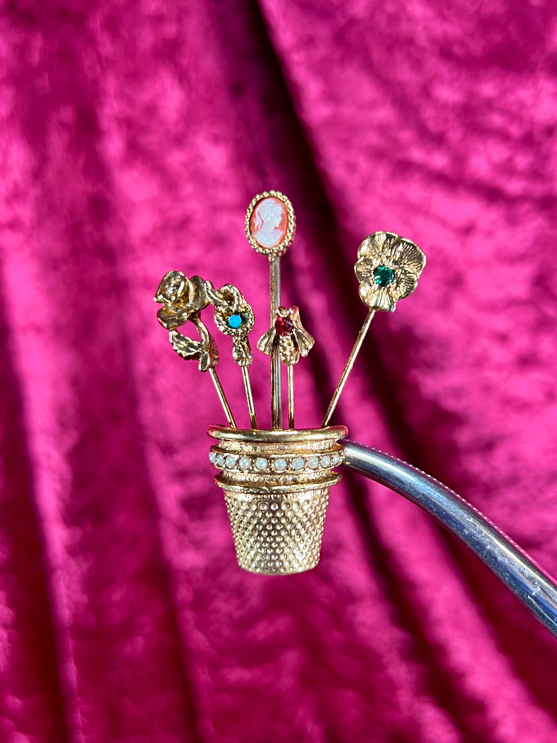 Vintage Jewelry - Brooch - Gold Tone - Overturned Thimble with Hat Pins