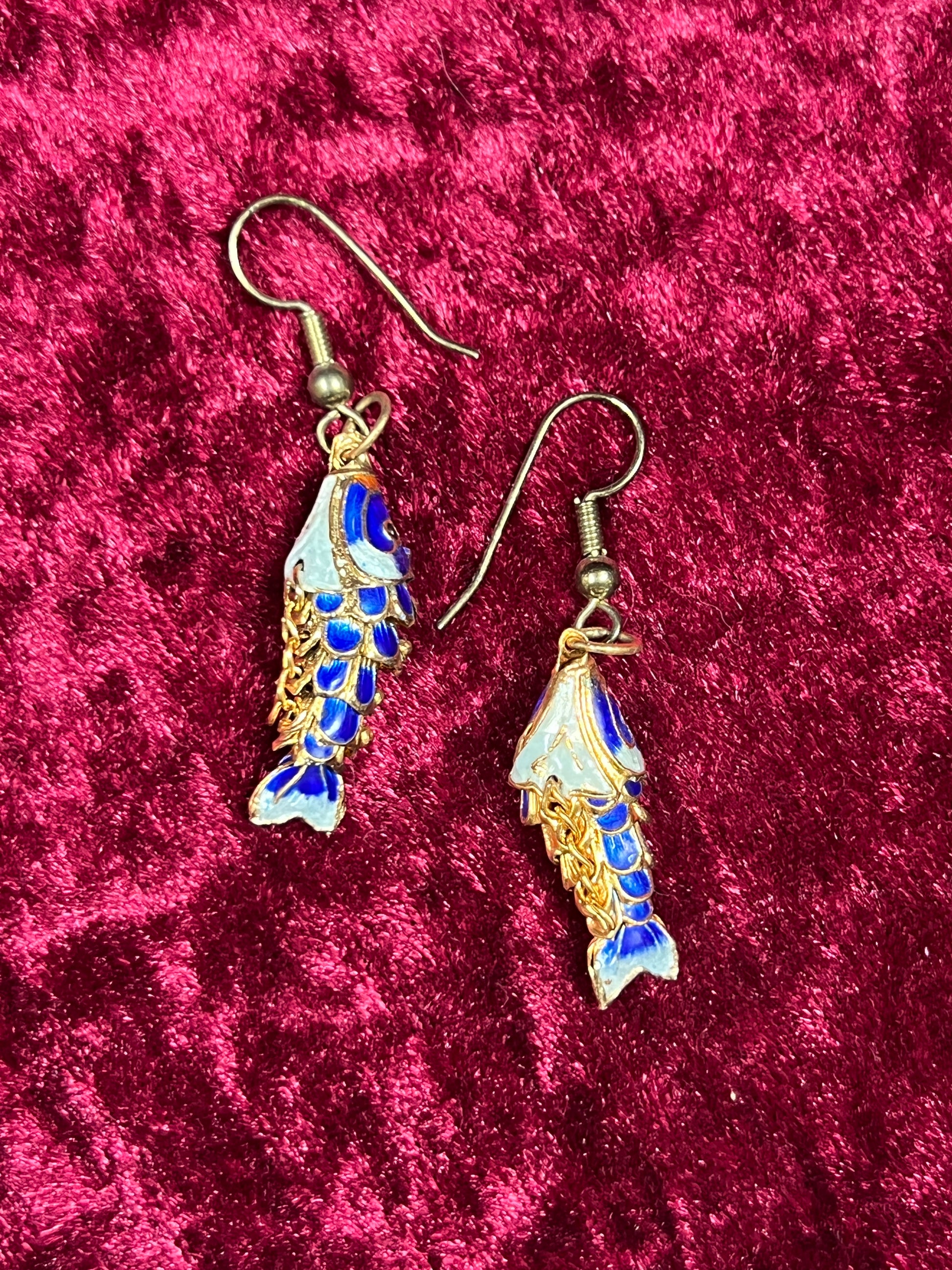 Vintage Jewelry - Drop Earrings - Gold Tone Metal - Articulated Enamel Koi Fish