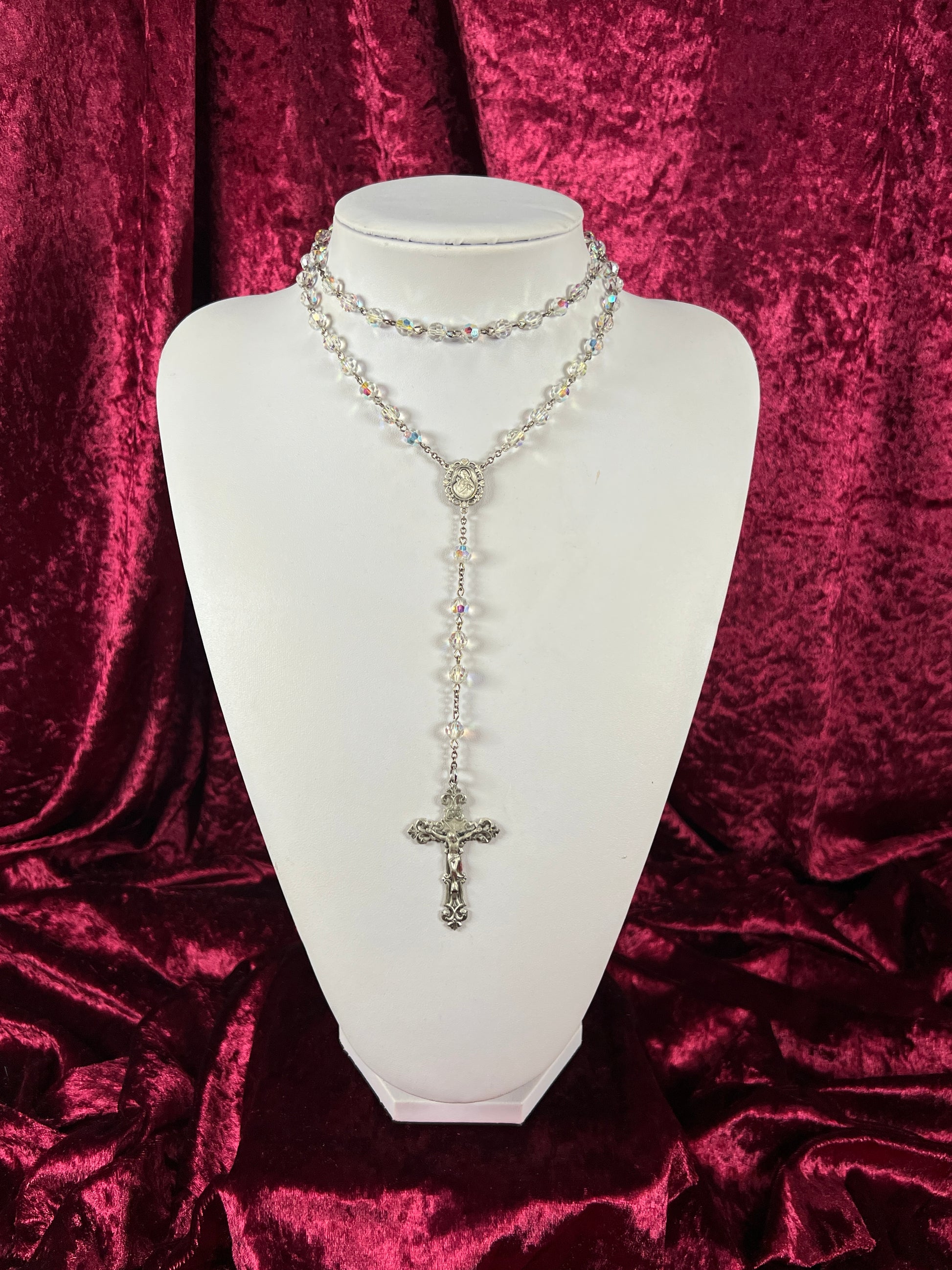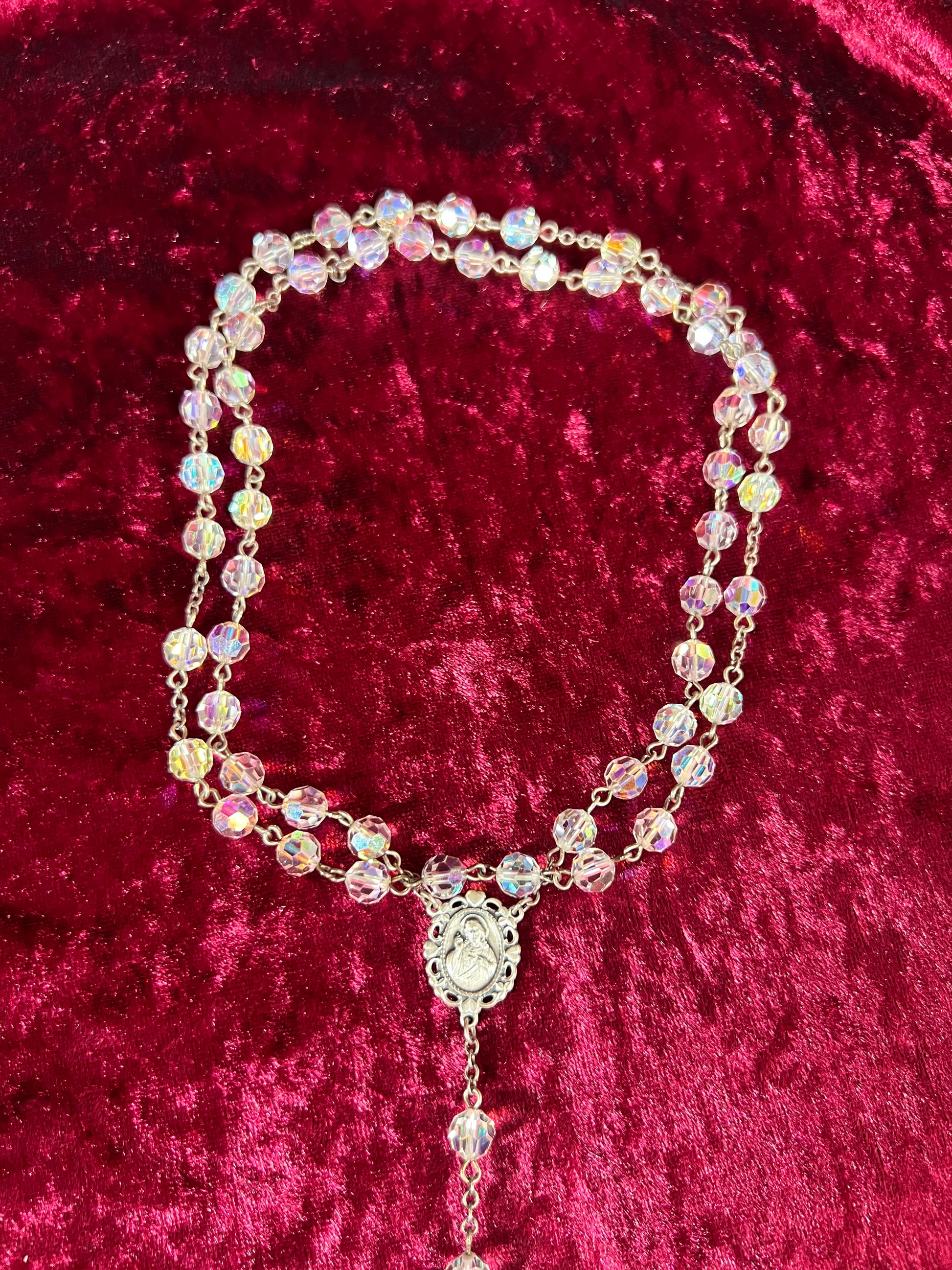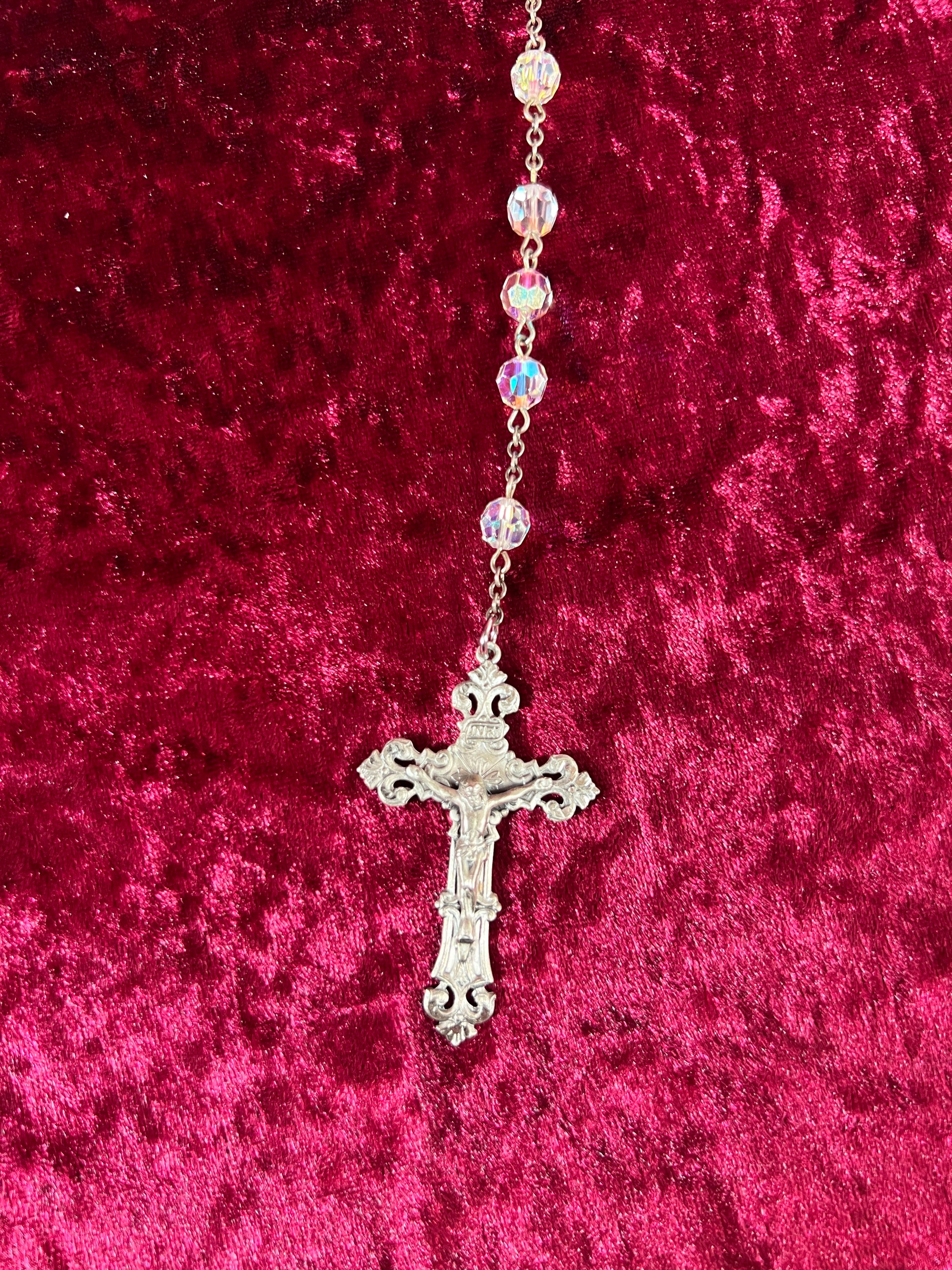 Faceted aurora borealis beads with a silver tone metal pendant cross.