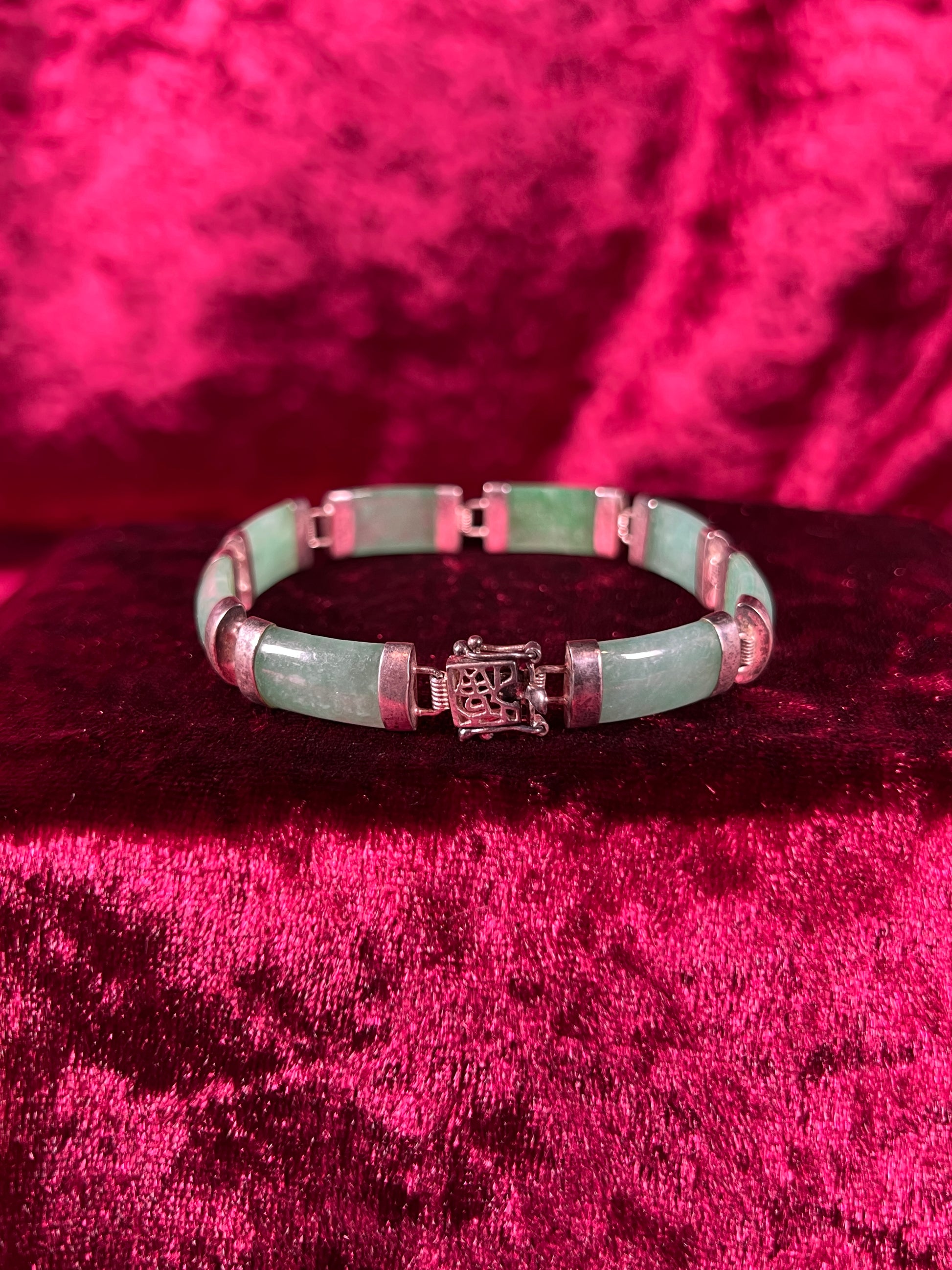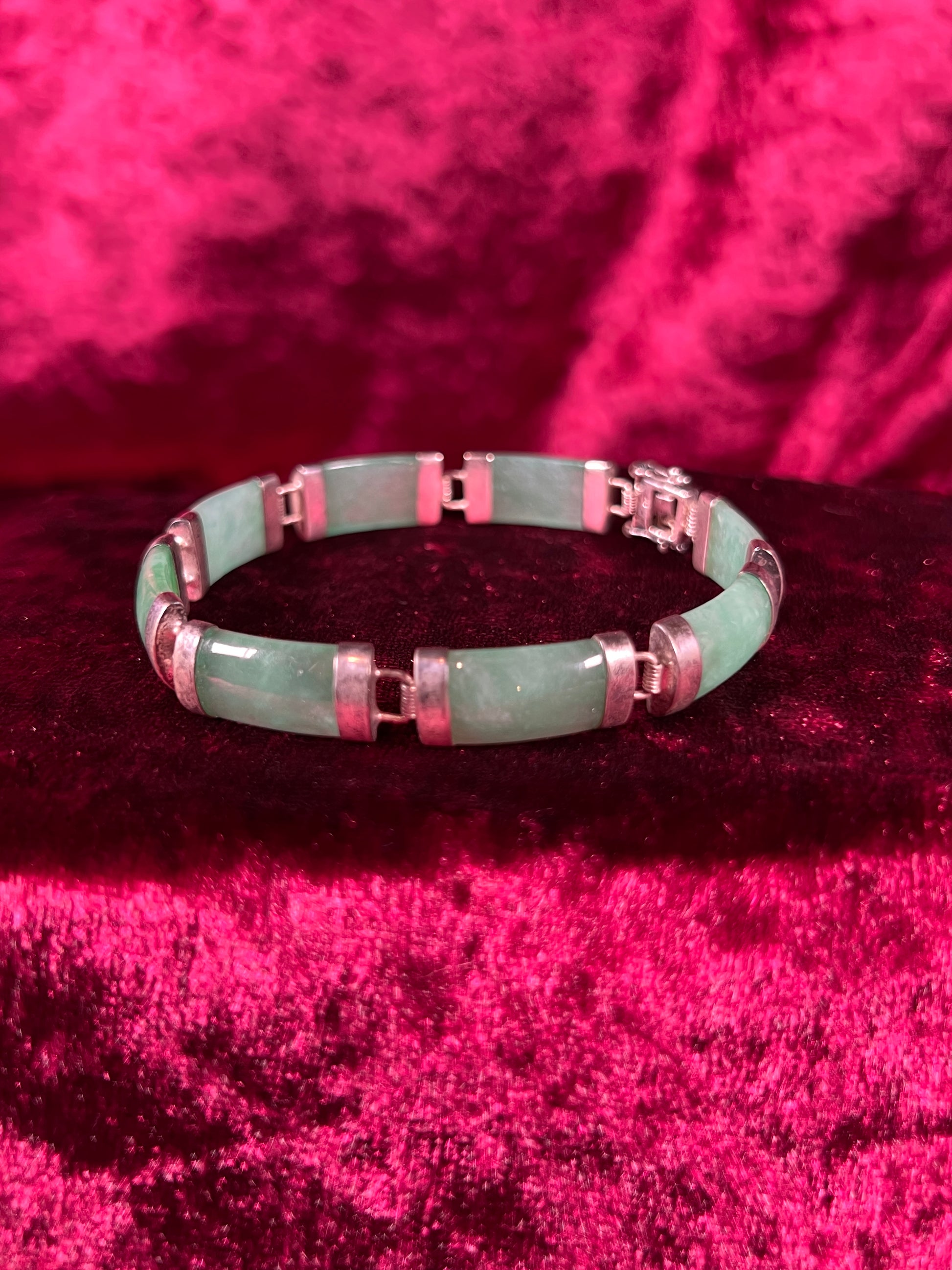 Vintage Jewelry - Link / Panel Bracelet - 925 Sterling Silver - Green Jade - 7.5"