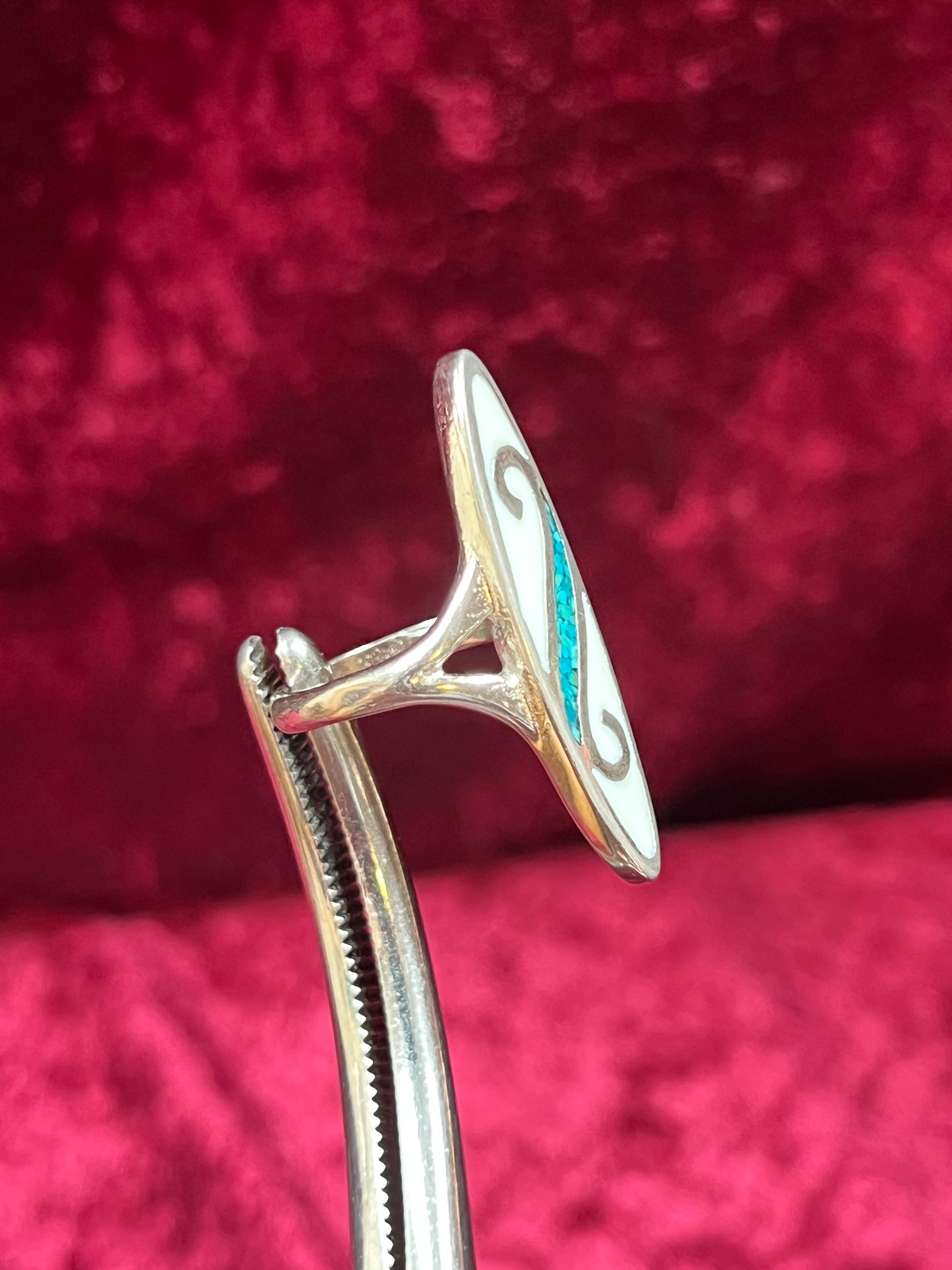 Vintage Jewelry - Marquise Ring - Sterling Silver - Turquoise Chip Inlay on White Stone - 8.5