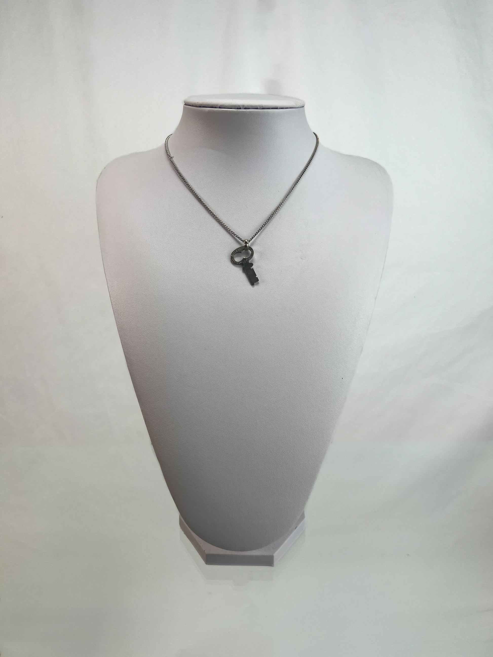 Measures: Total chain length end to end is 16 3/4". The key is 1 1/4"long. Pendant hangs below the collarbone, measurement dependent.