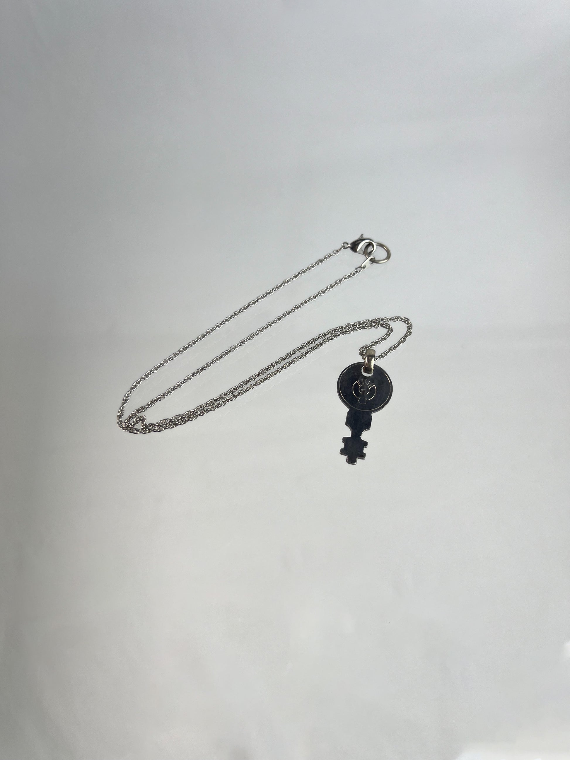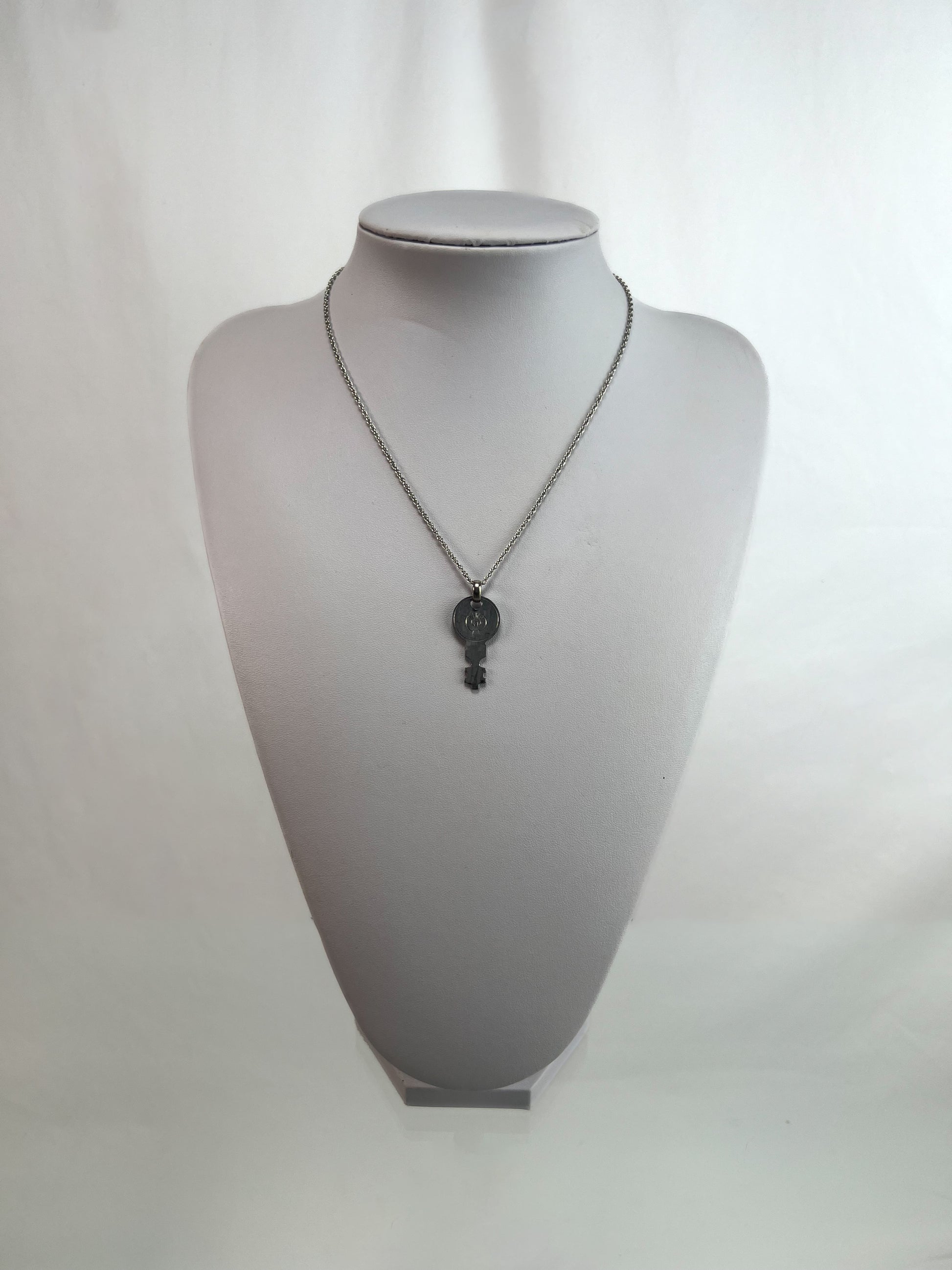 Measures: Total chain length end to end is 18 3/8". The key is 1 3/8" long. Pendant hangs below the collarbone, measurement dependent.