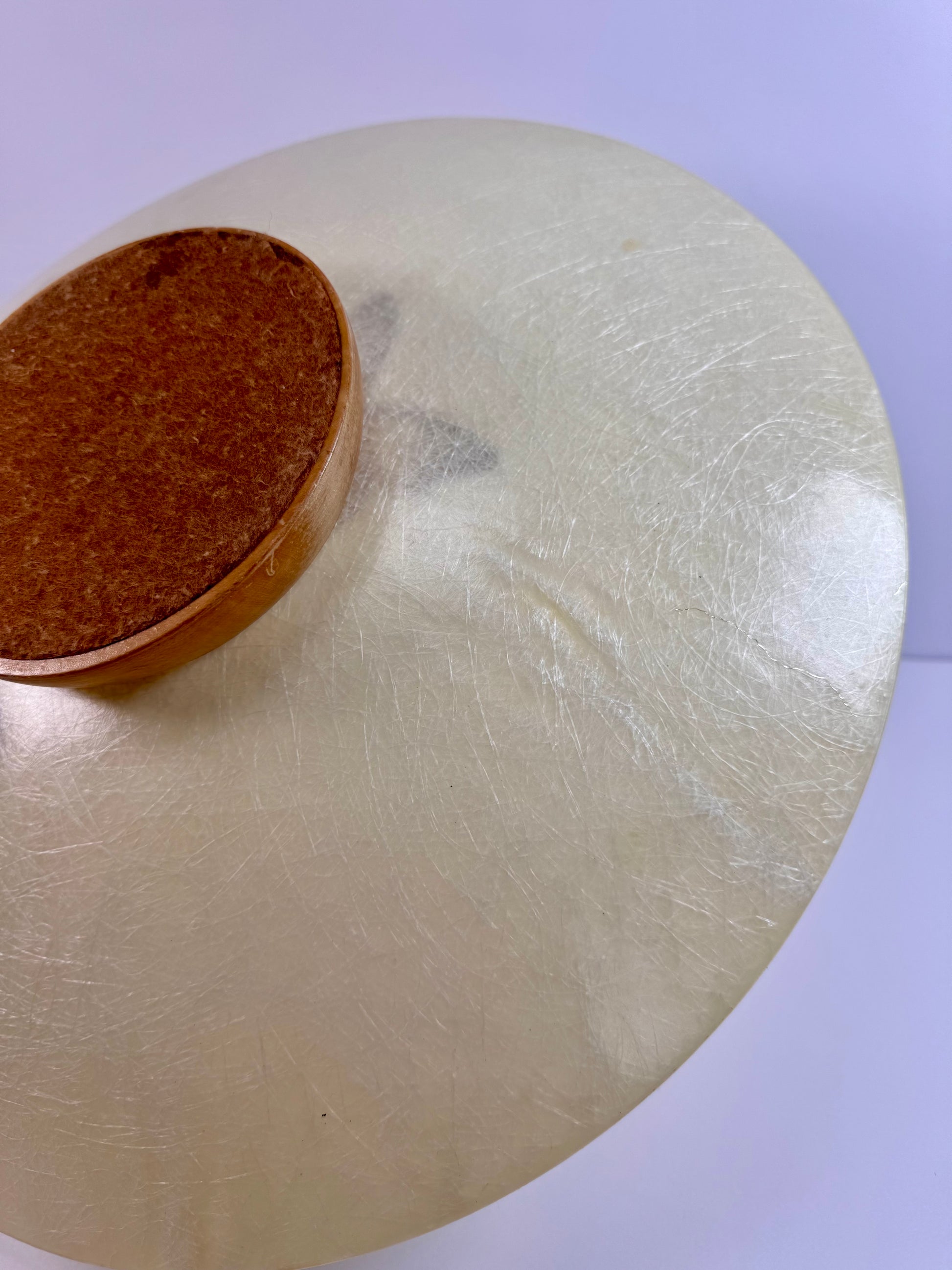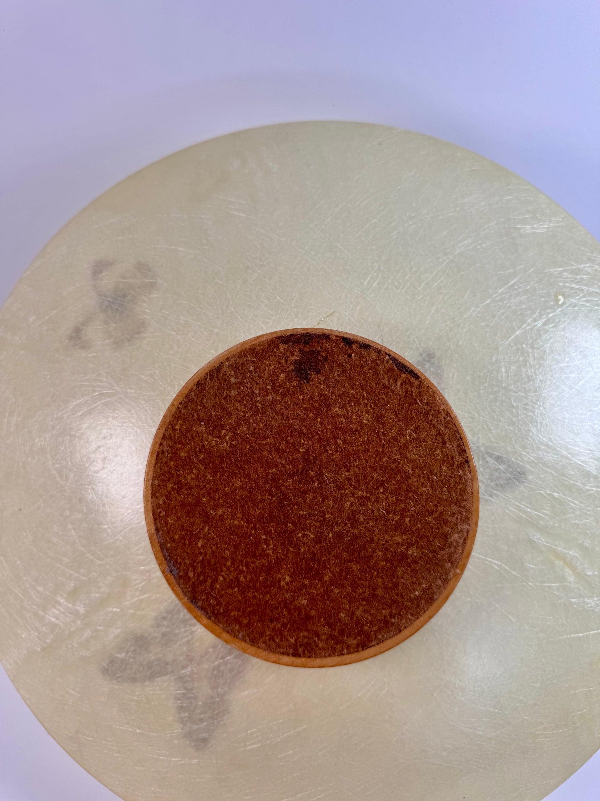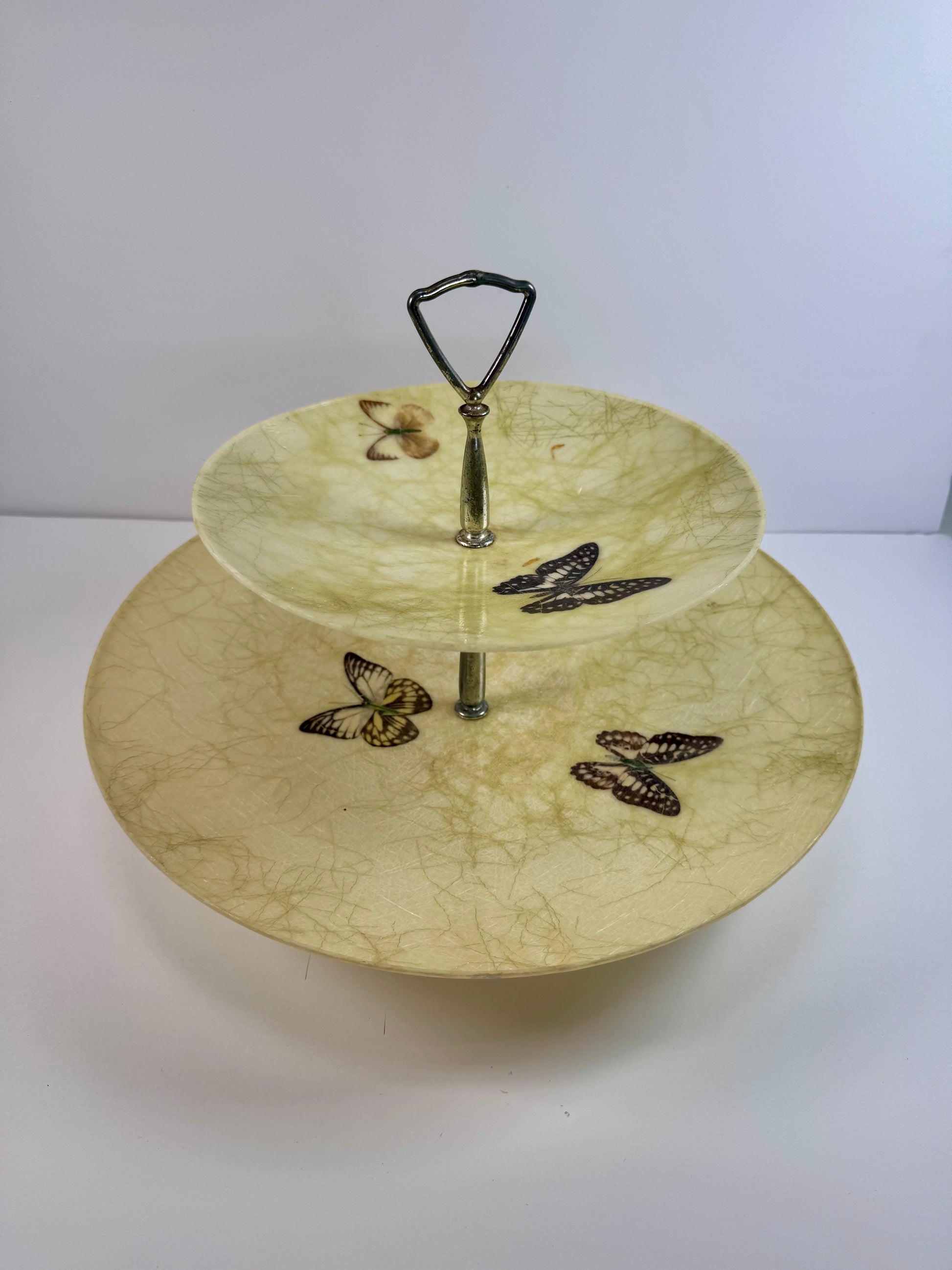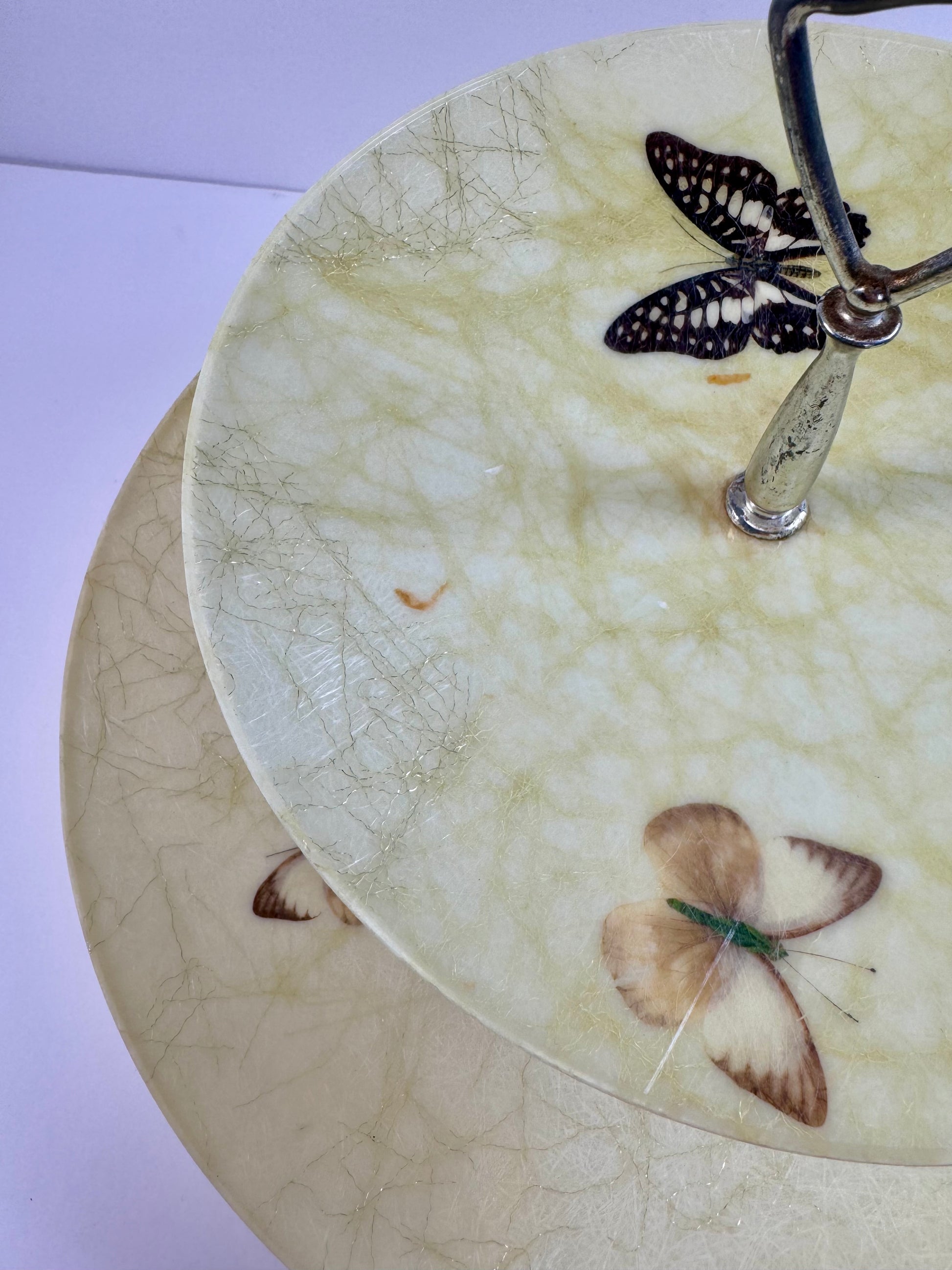 Add some whimsical mid mod fantasy to your kitchen table with this 1960s two-tier serving tray featuring spaghetti fiberglass trays decorated with little butterflies. This serving tray can be dismantled for easy cleaning. This item will be shipped unassembled.