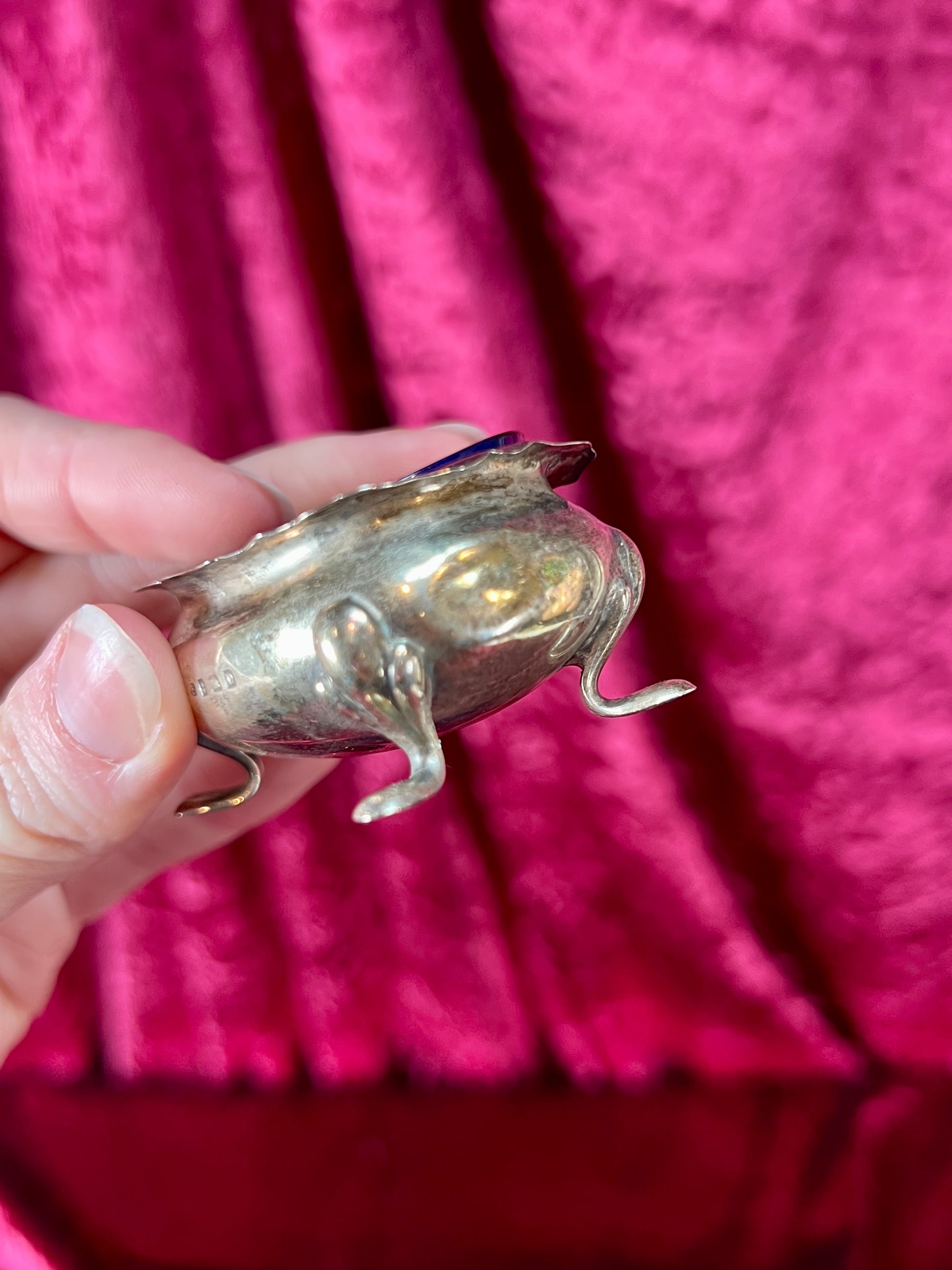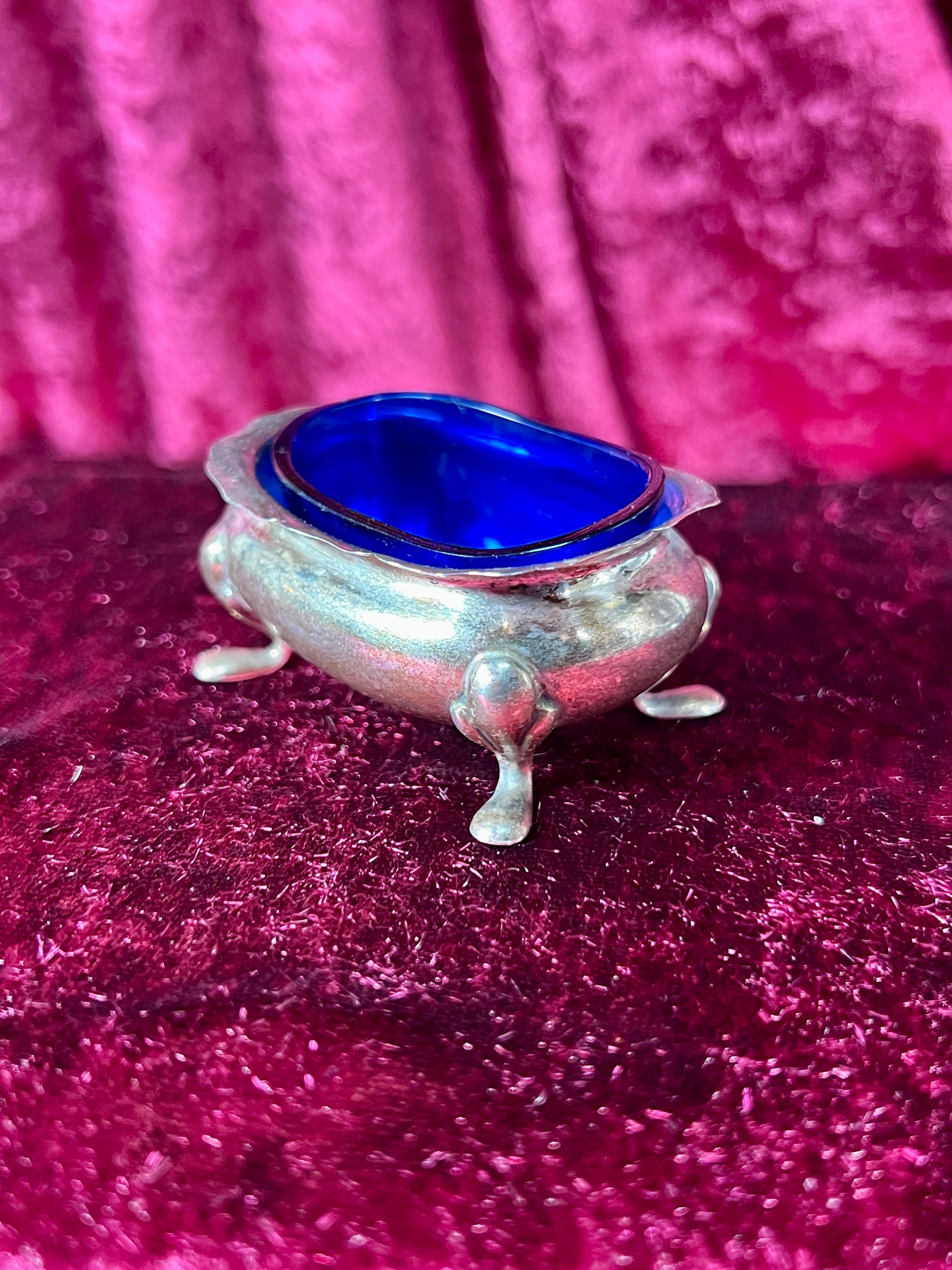Vintage Kitchen - Footed Salt Cellar with Cobalt Blue Glass Insert - Sterling Silver - Dented
