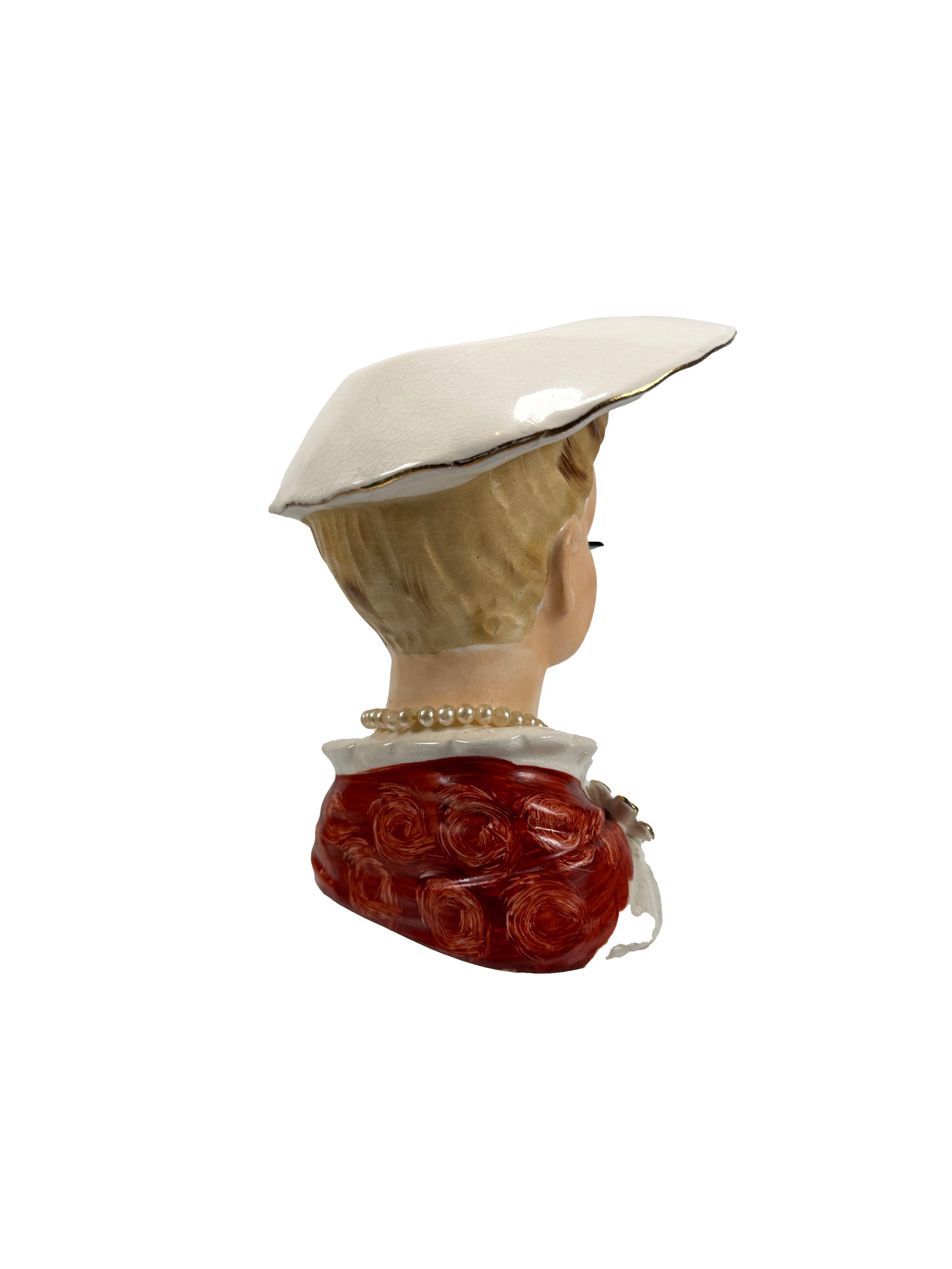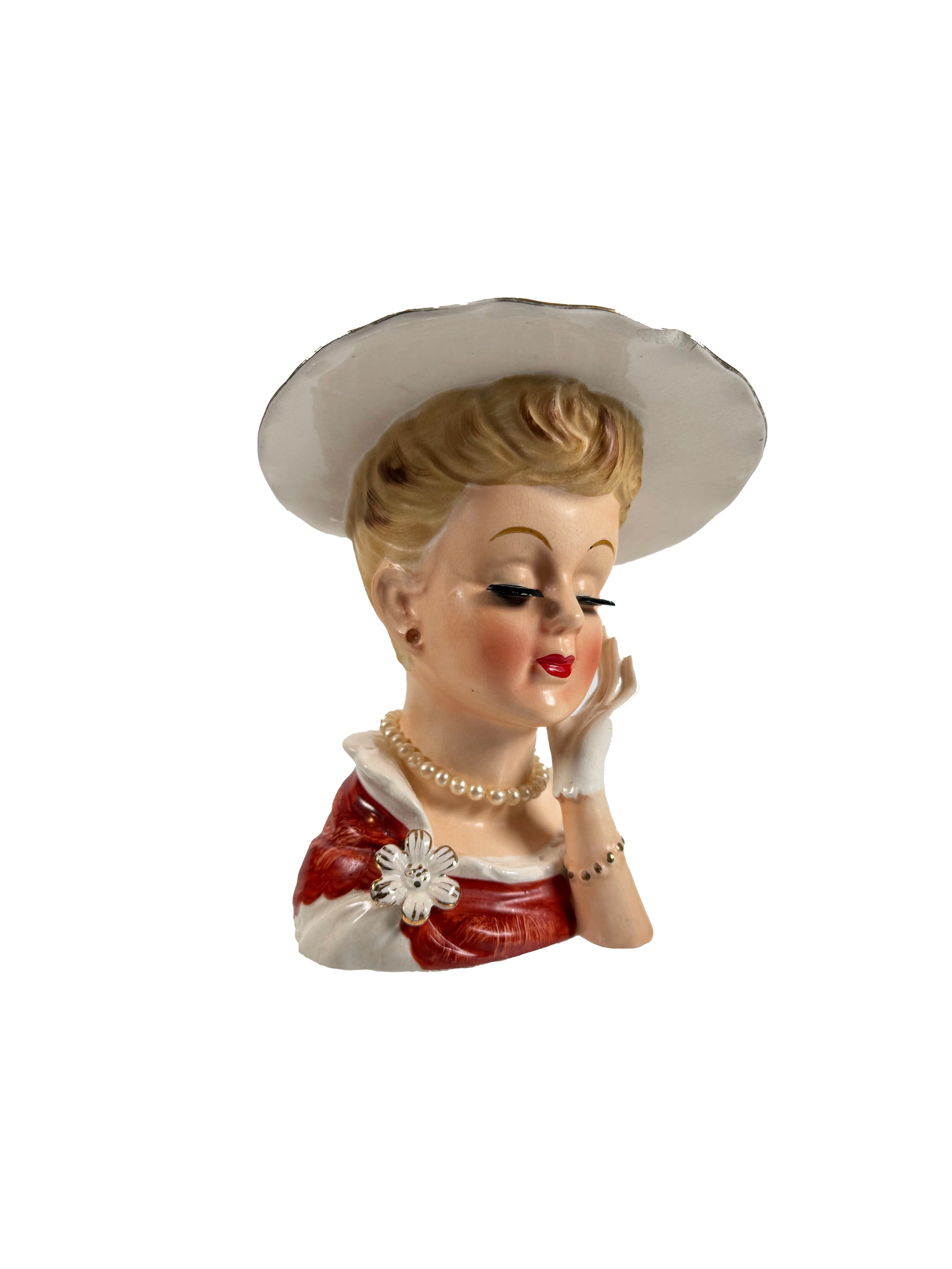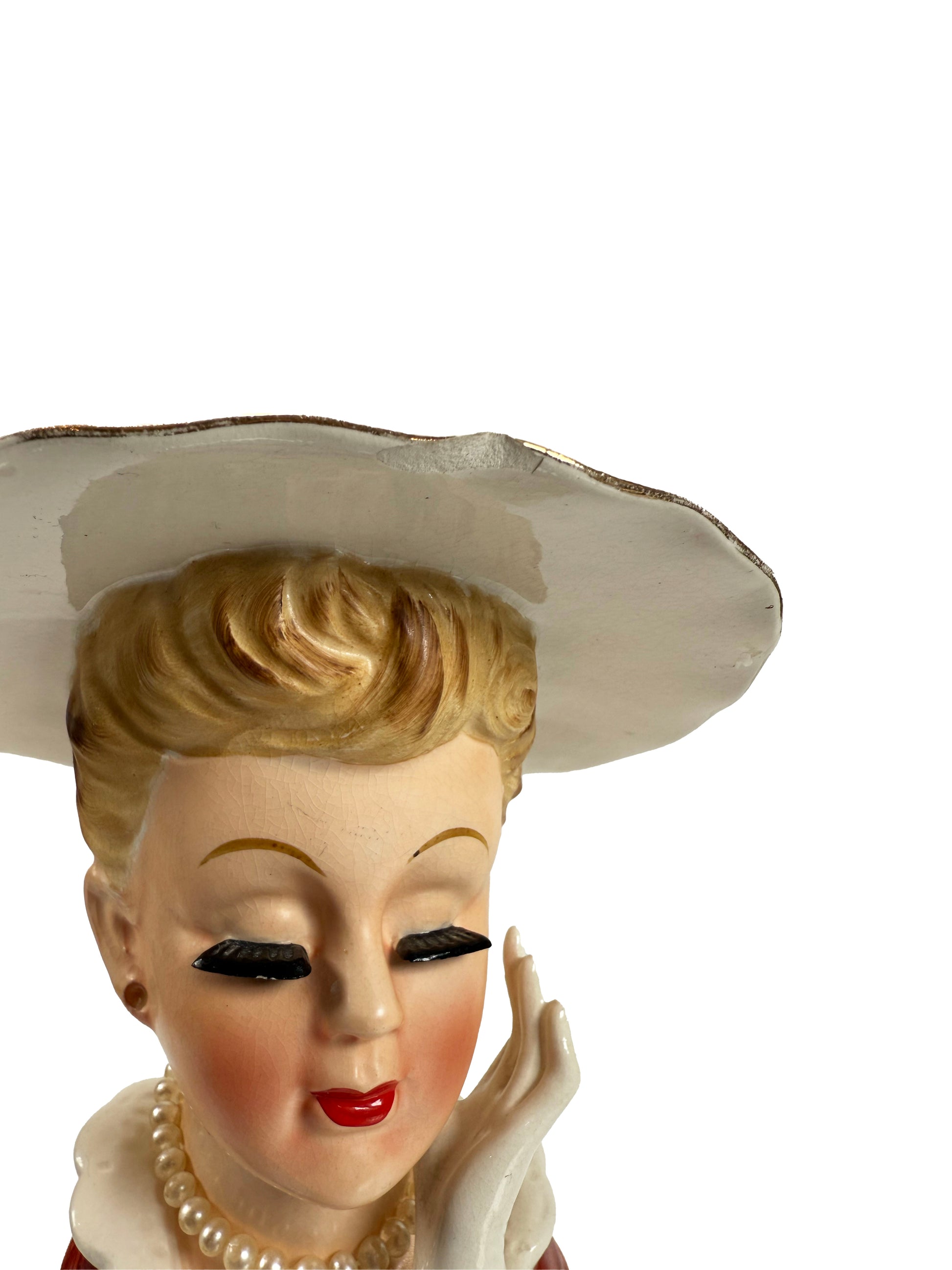 Condition: Missing her pearl earrings. One half inch chip on the brim of her hat.