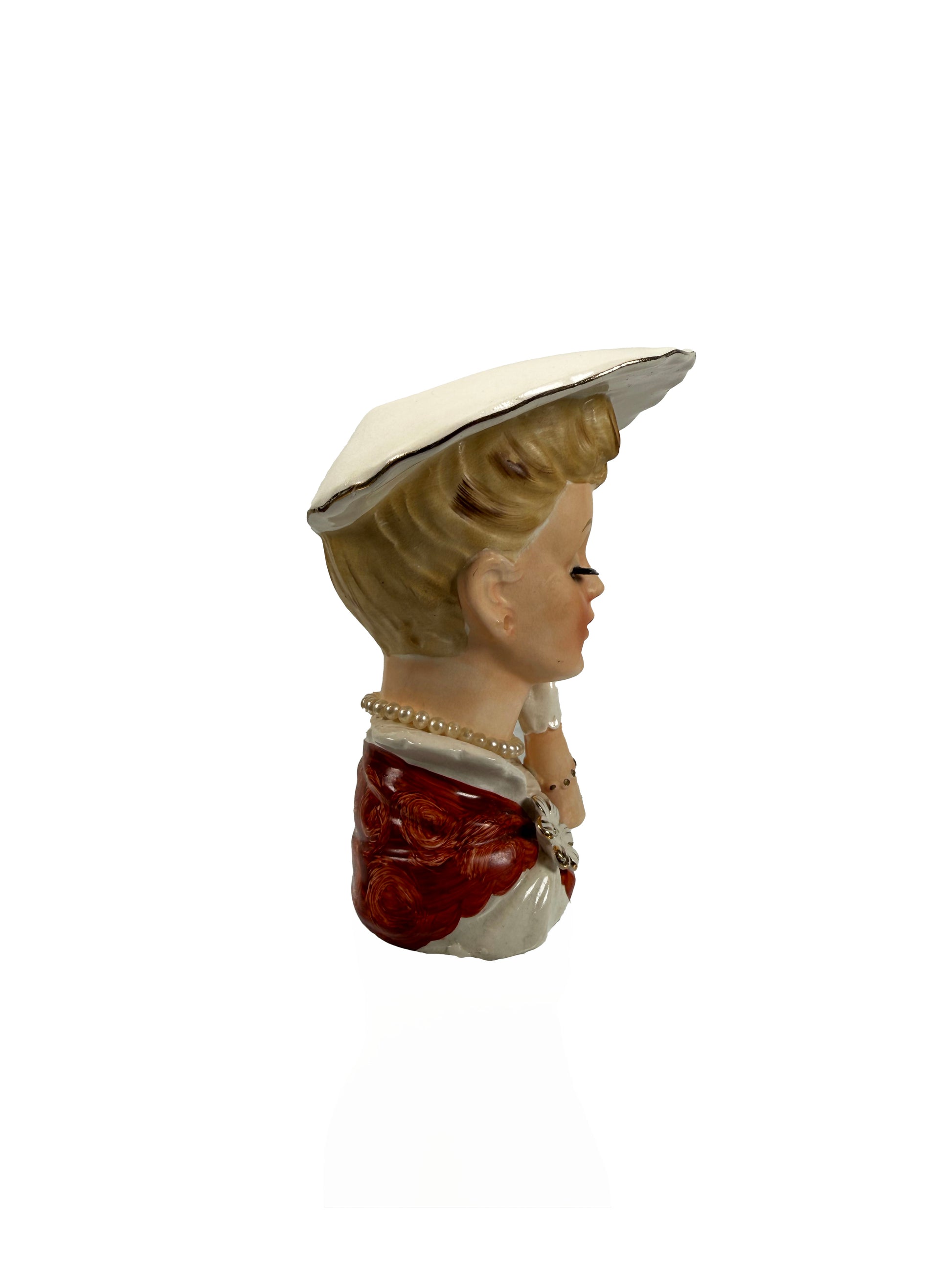 Vintage Lady Head Vase - Pearl Necklace and Floral Brooch - Inarco #E241
