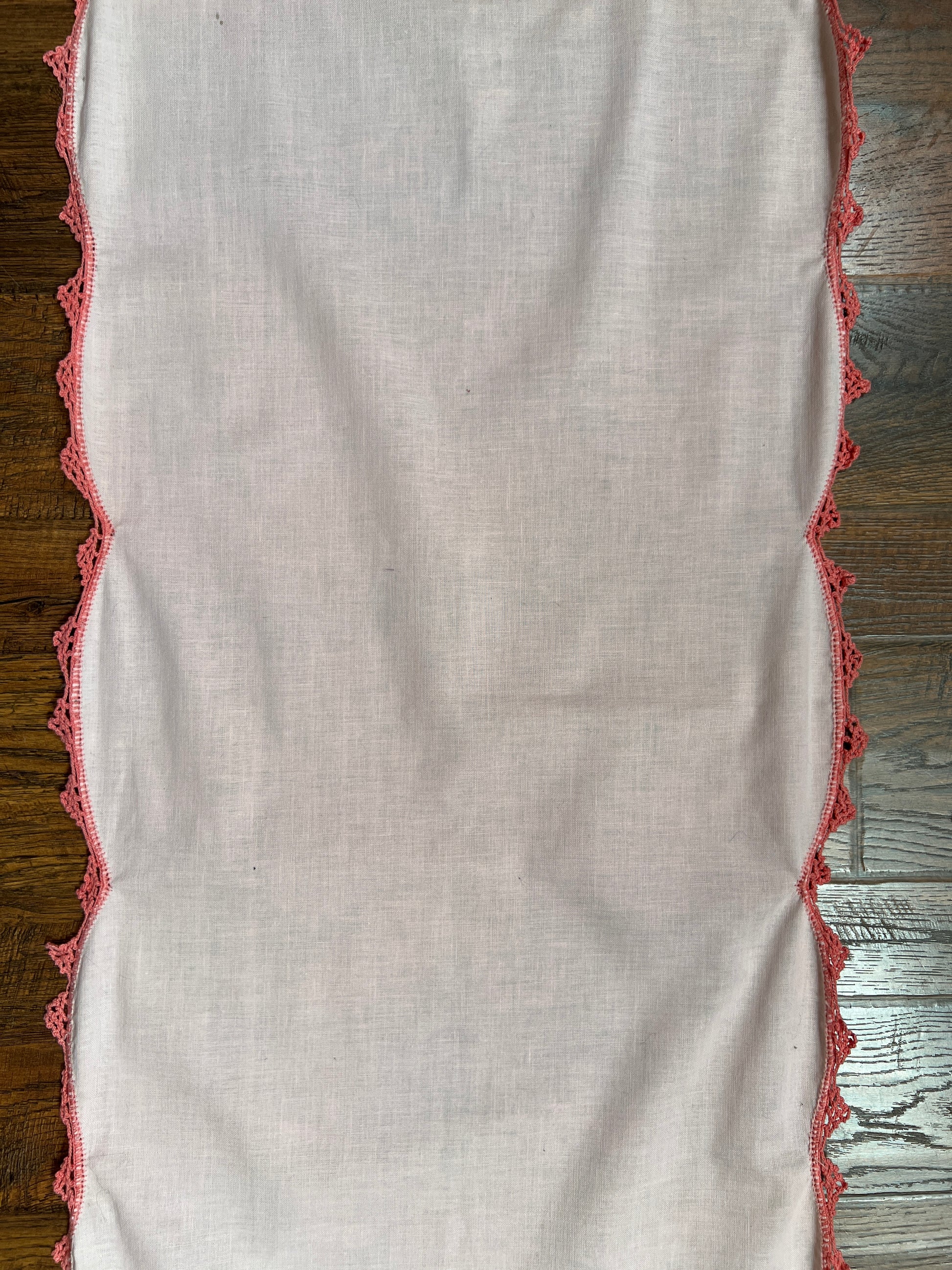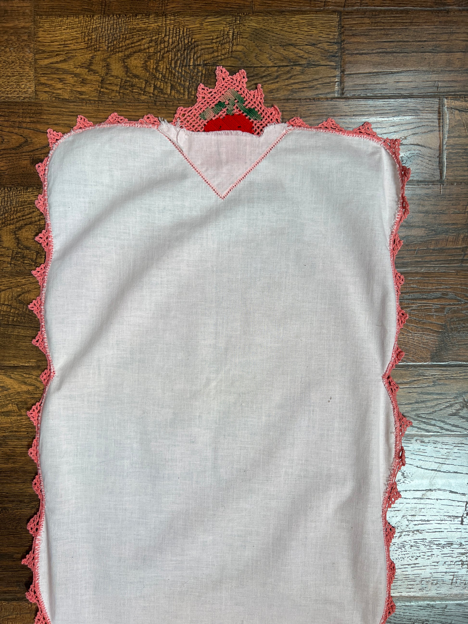 Vintage Linens - Table Runner with Lace Trim - Pink with Red Rose