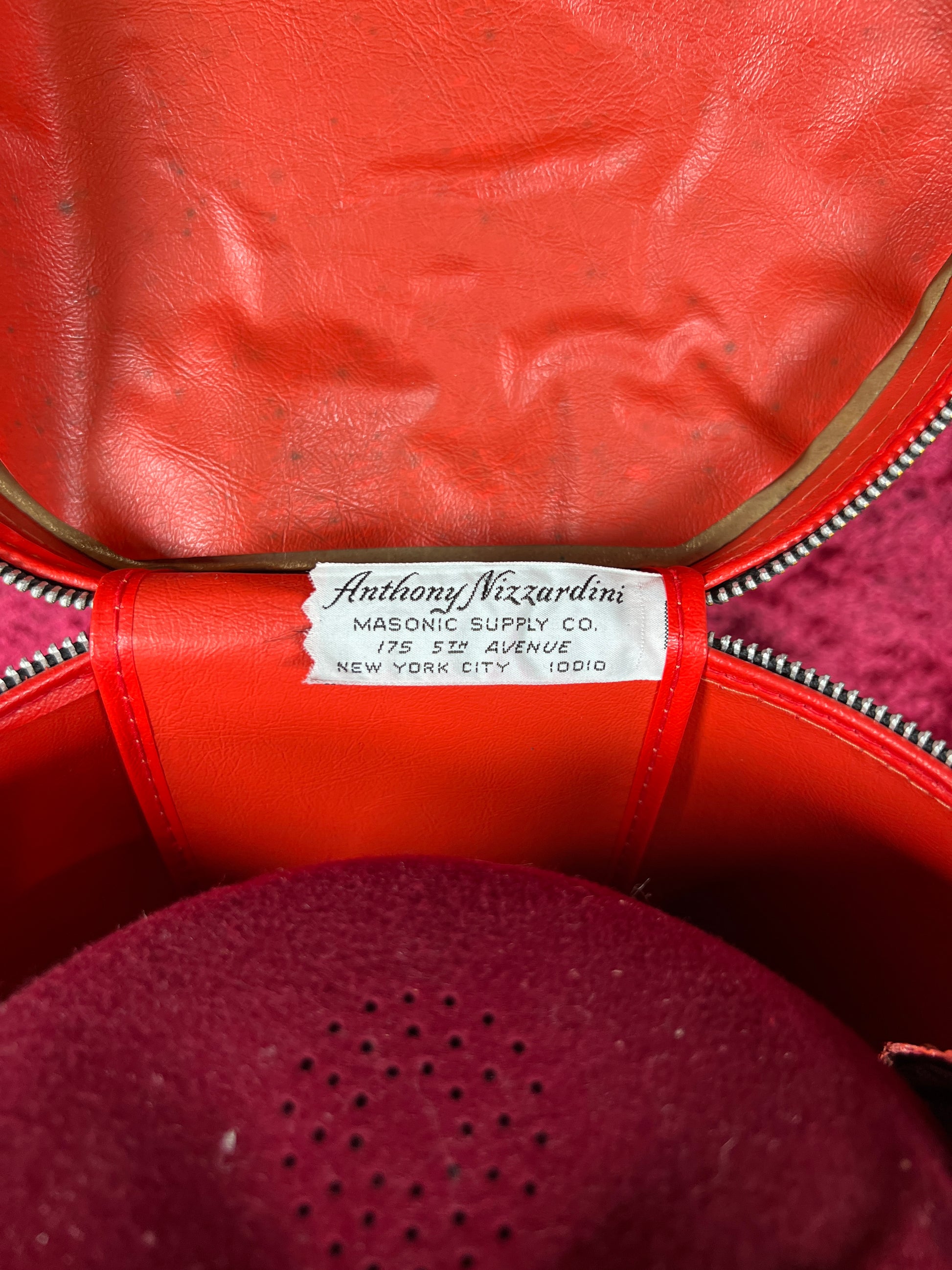 Condition: Hat box zipper is broken. Leather is not cracked anywhere, the hardware is slightly rusted on top. Handle is still attached. Fez has been previously worn and used. The embroidery on the front is de-threaded in the middle. The brooches have all rhinestones present in settings.