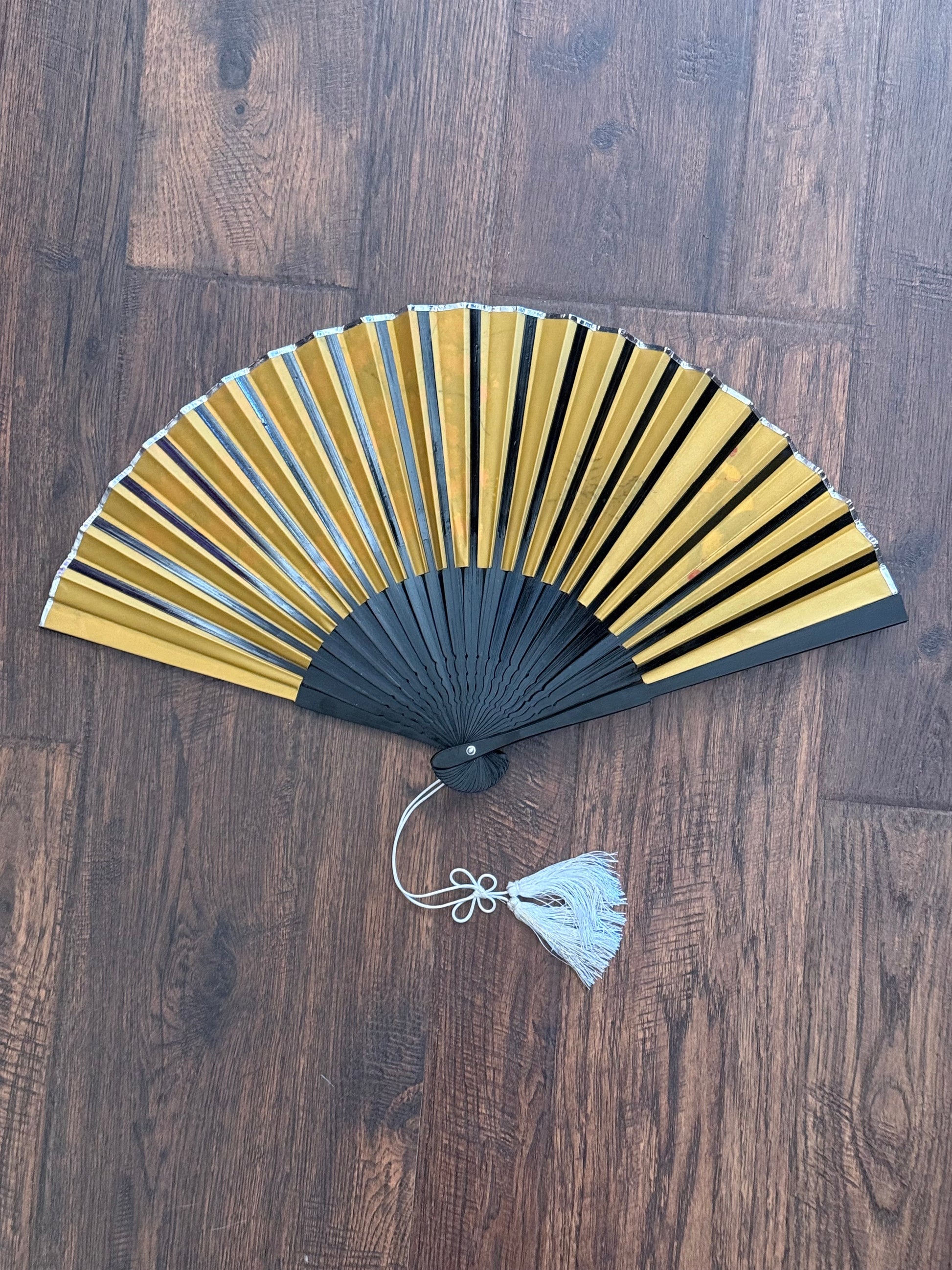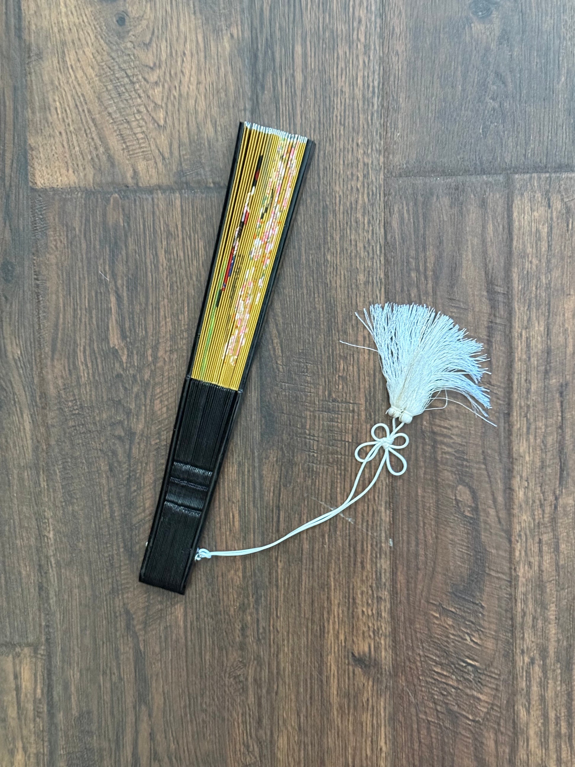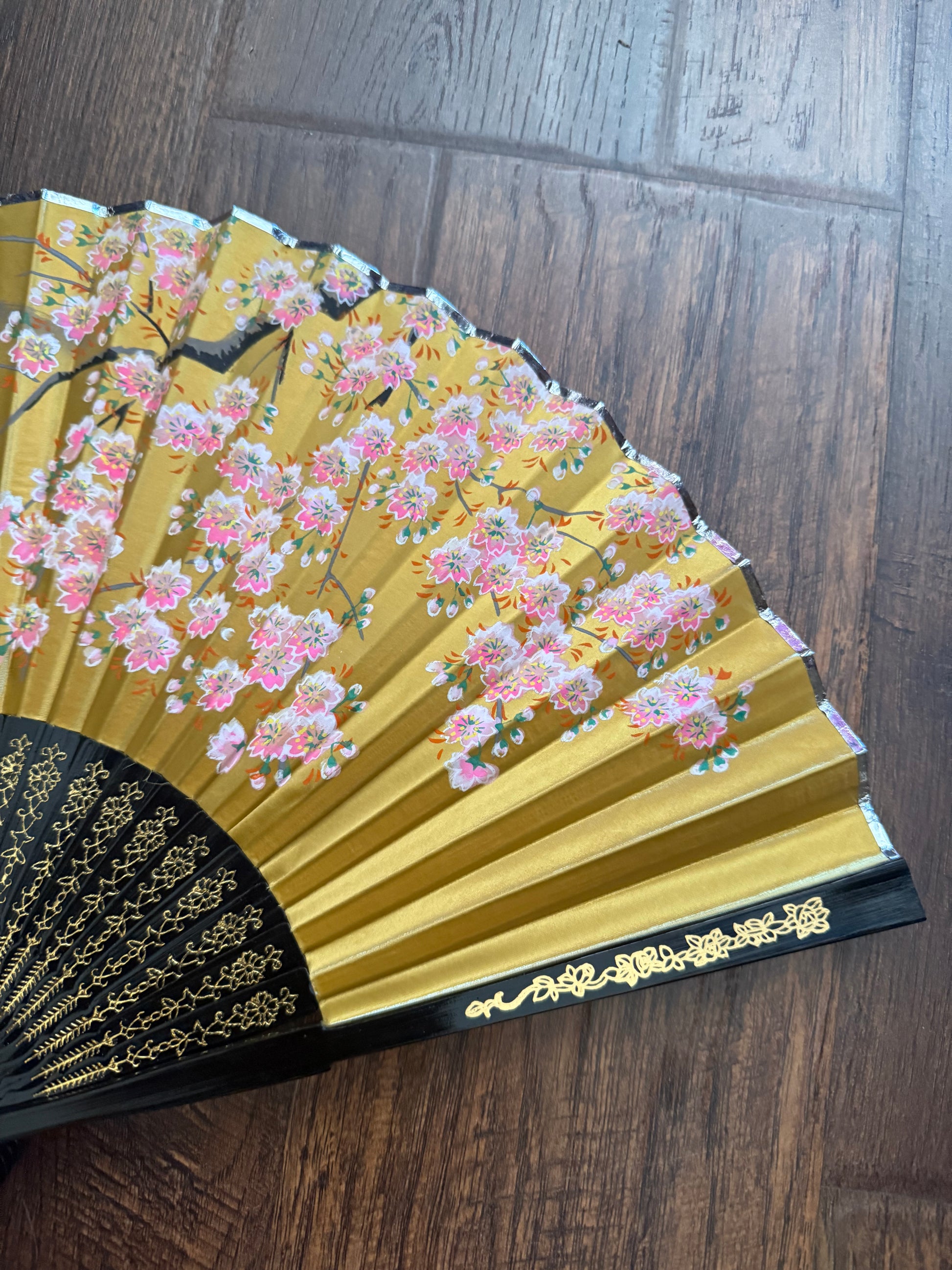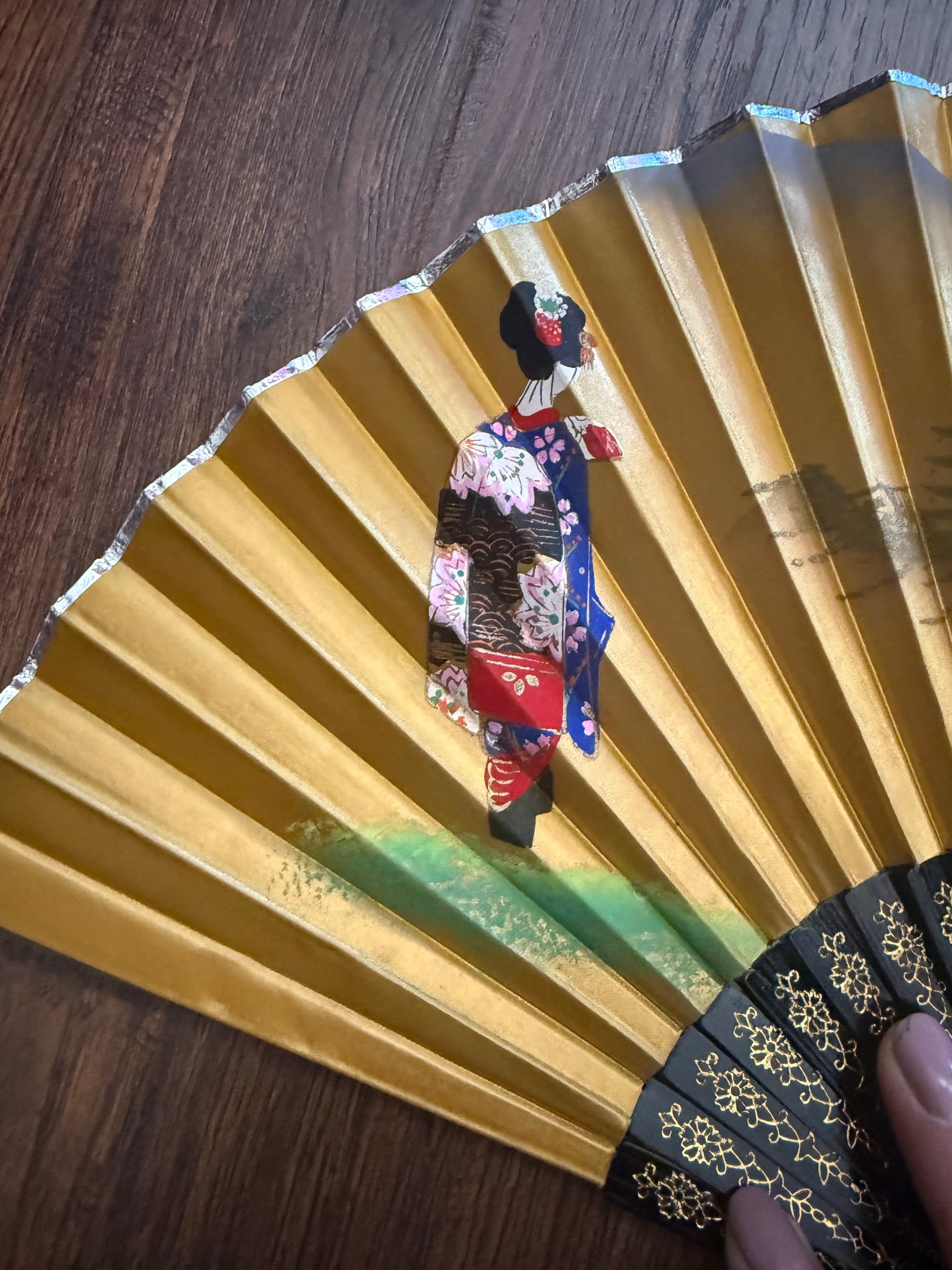 Vintage Paper Fan - Gold Paper Japanese Sakura Blossoms with Geisha
