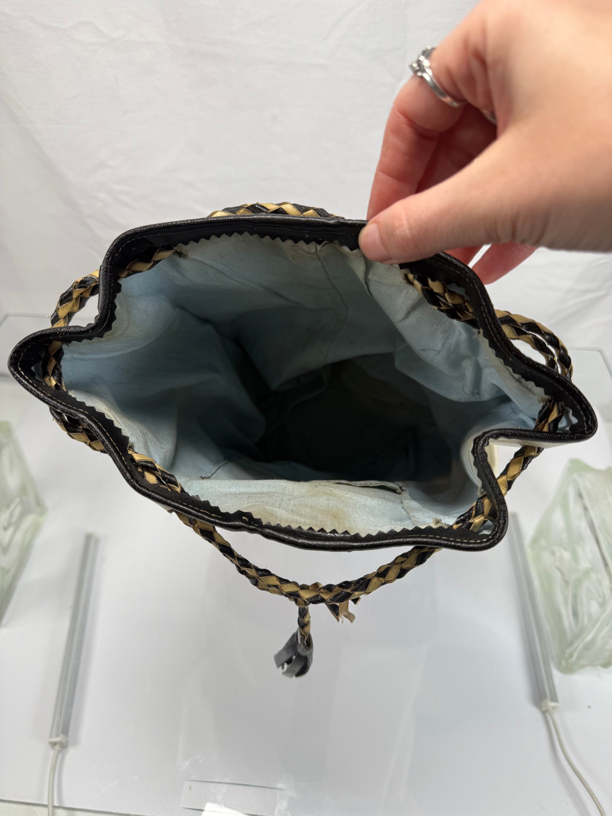 Gorgeous woven black and white leather stitched bucket bag, with braided leather and tassel handle. This is a beautiful vintage piece lined with blue fabric. This bag has 4 smaller outer pockets as well as 2 sewn in fabric pocket on the inside.