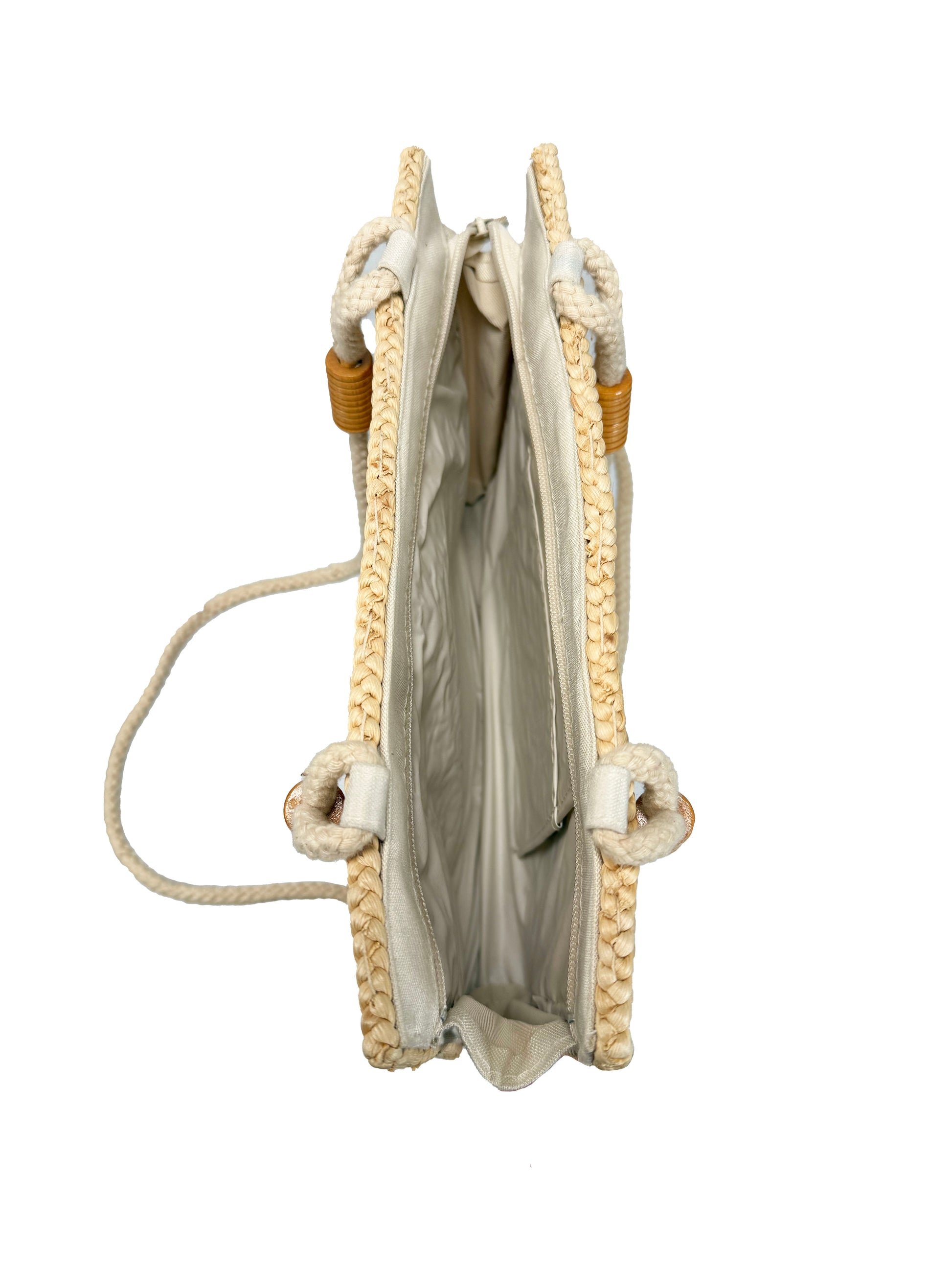 Condition: Good vintage condition, the wood pieces on the handles do slide off where they were once glued. They could be glued down again easily. Some looze threads in the rattan bag area. Inside is very clean, looks unused.