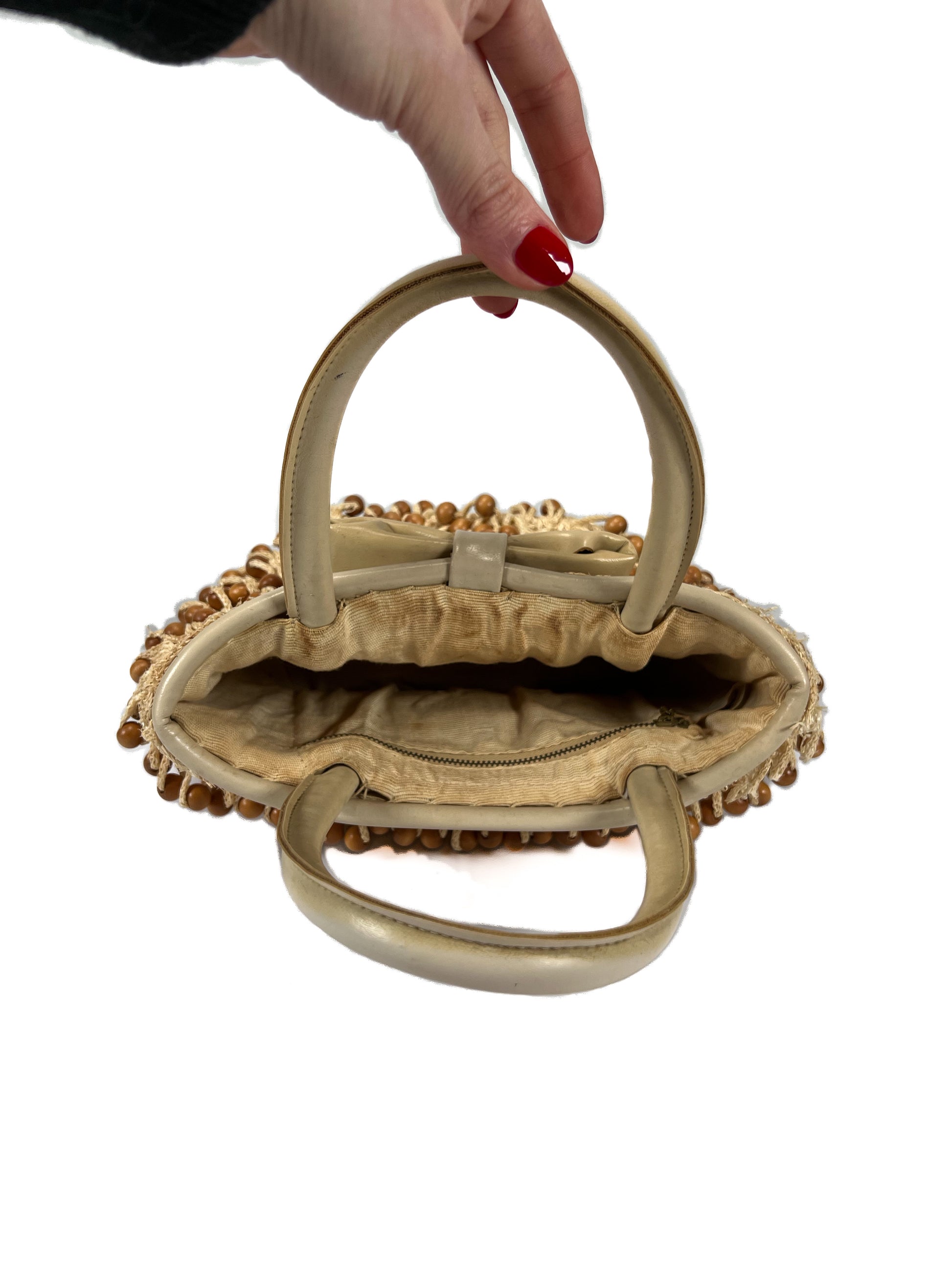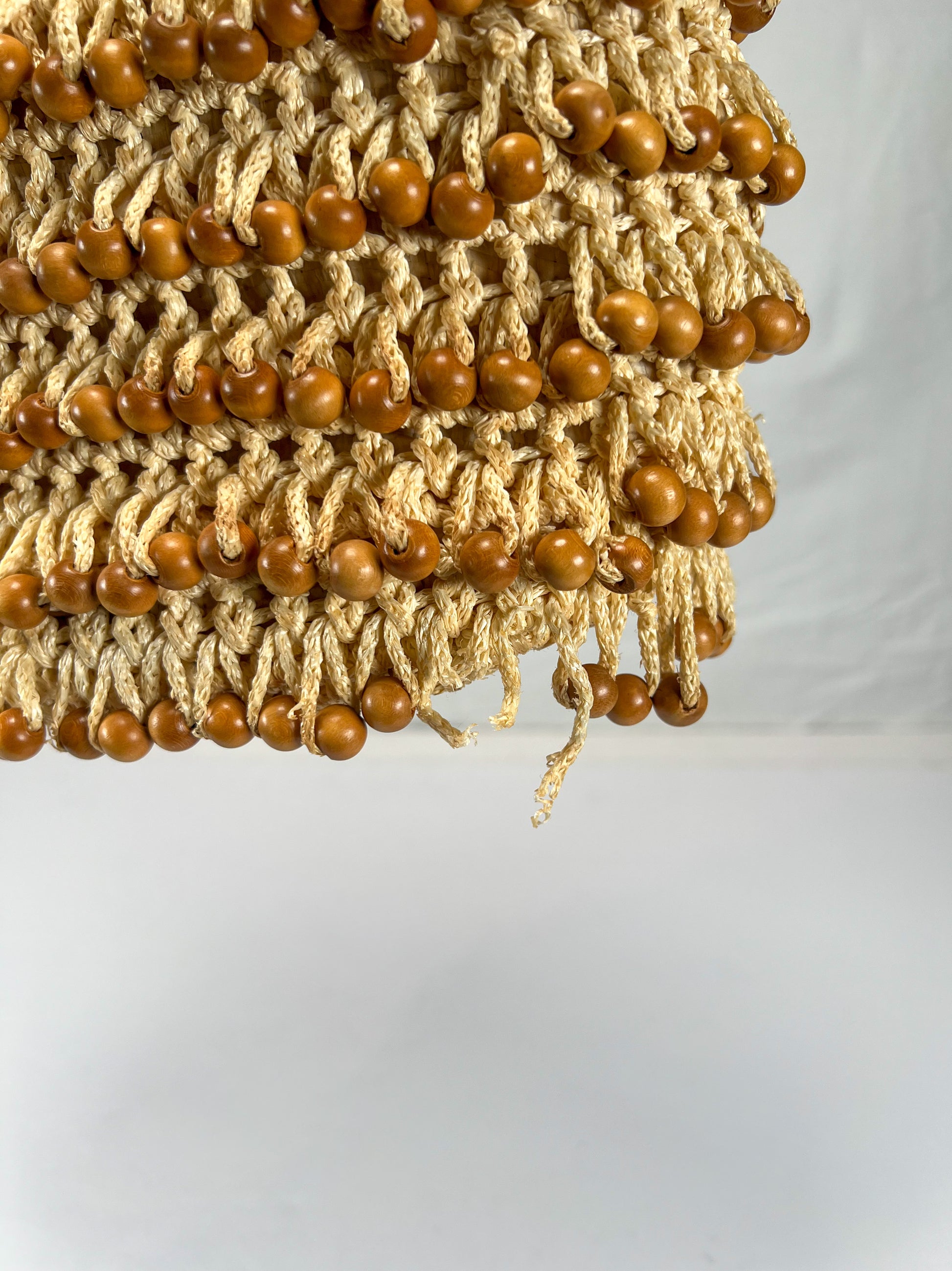 Condition: Crocheting on the outside is frayed in a few places and there are a few beads missing towards the bottom. Staining on the inner lining and some scuff marks on the handles.