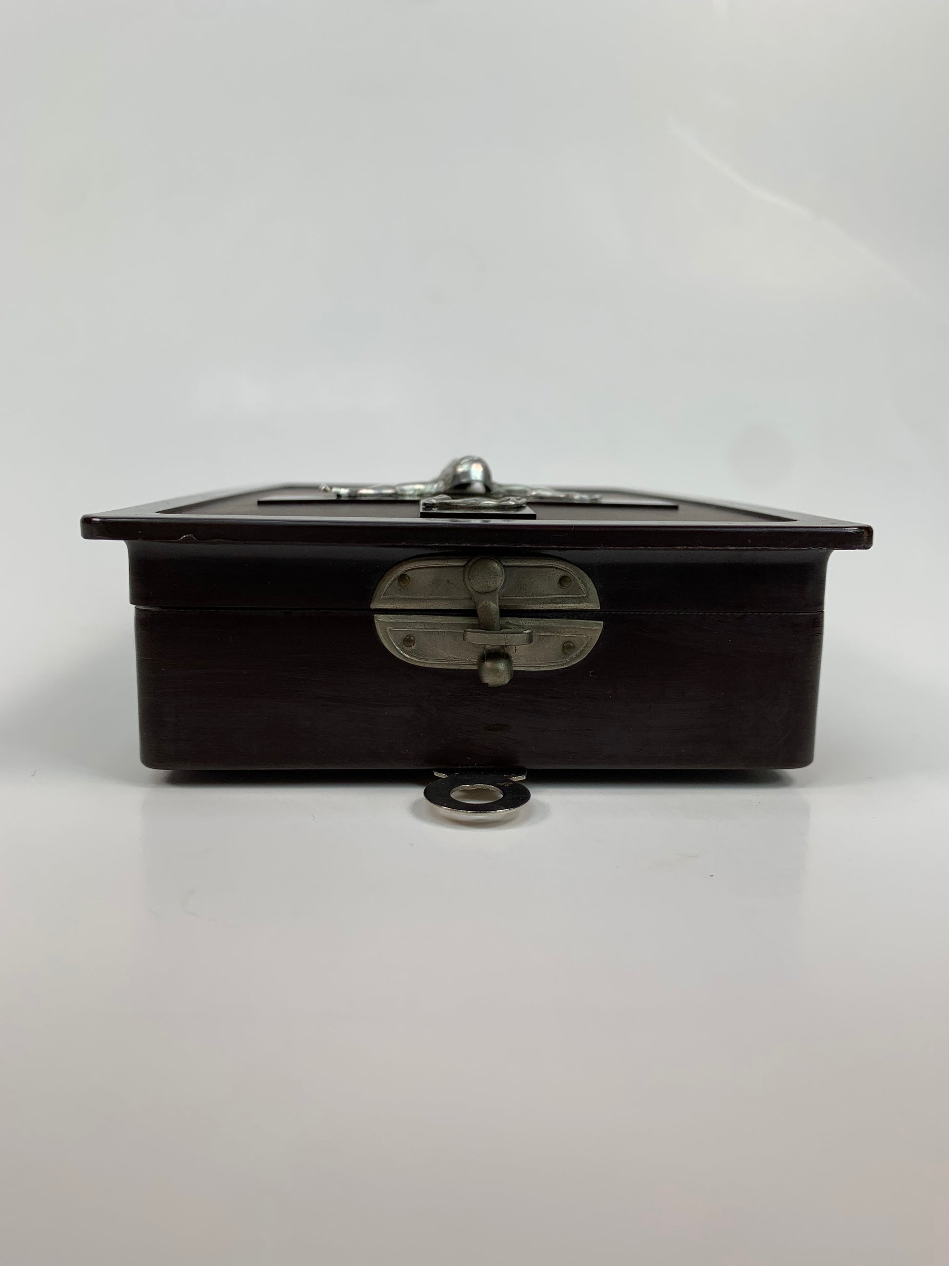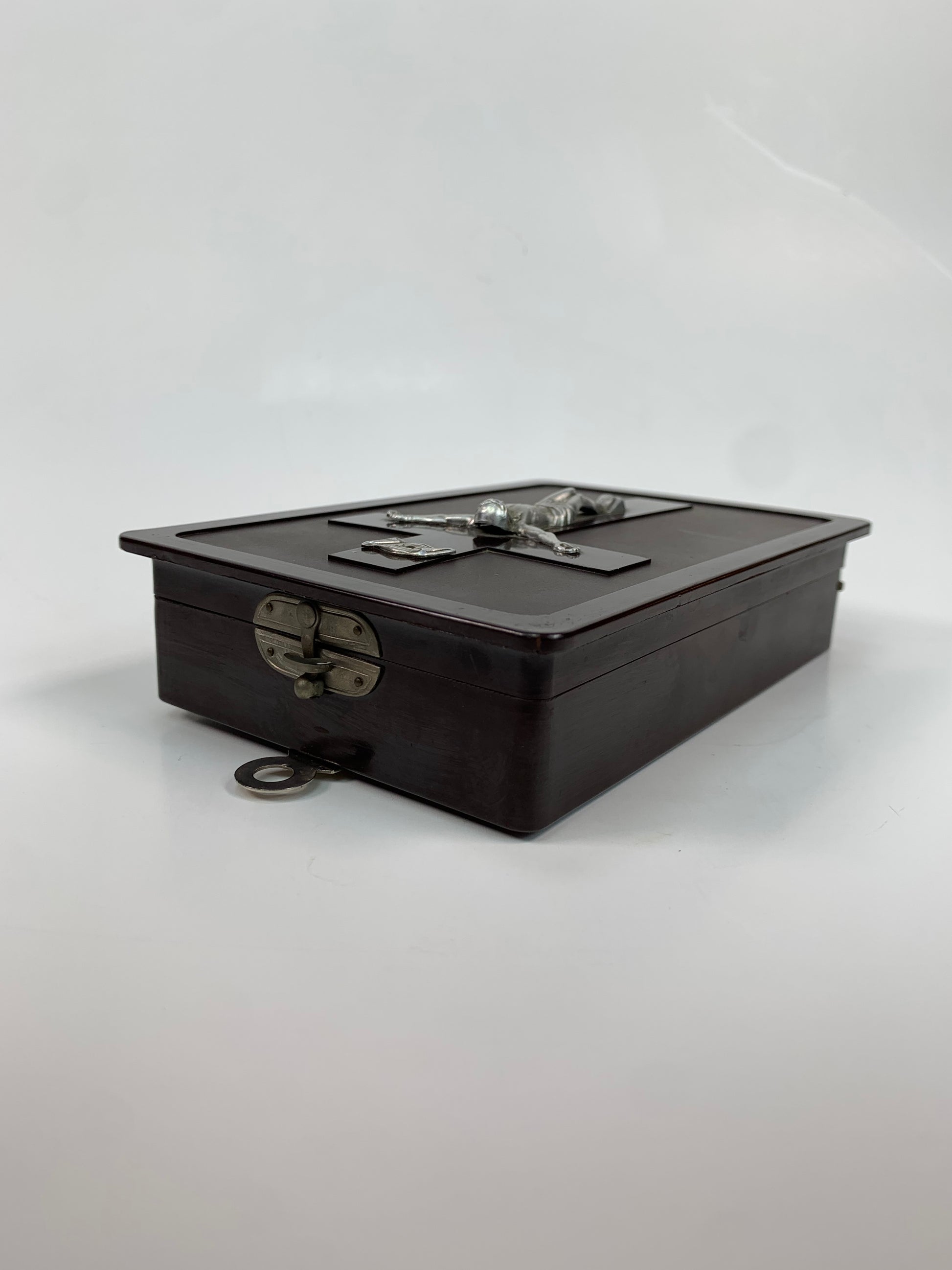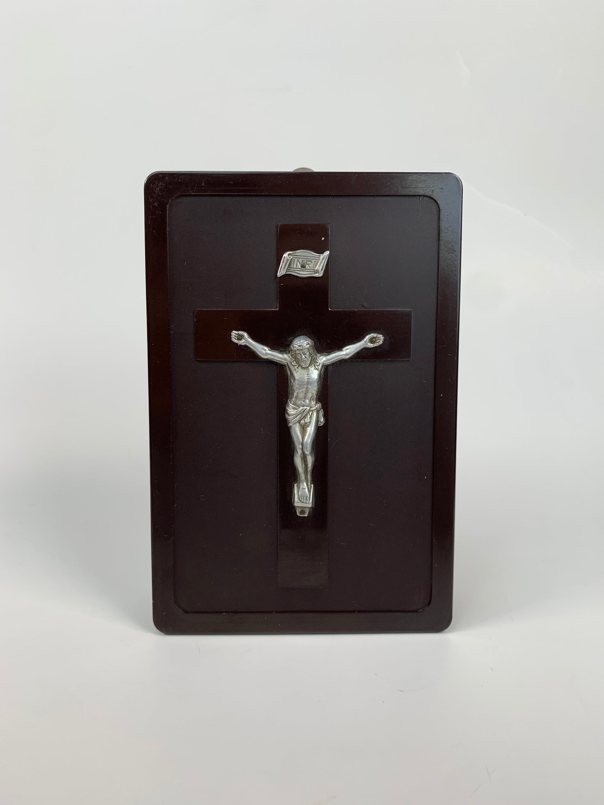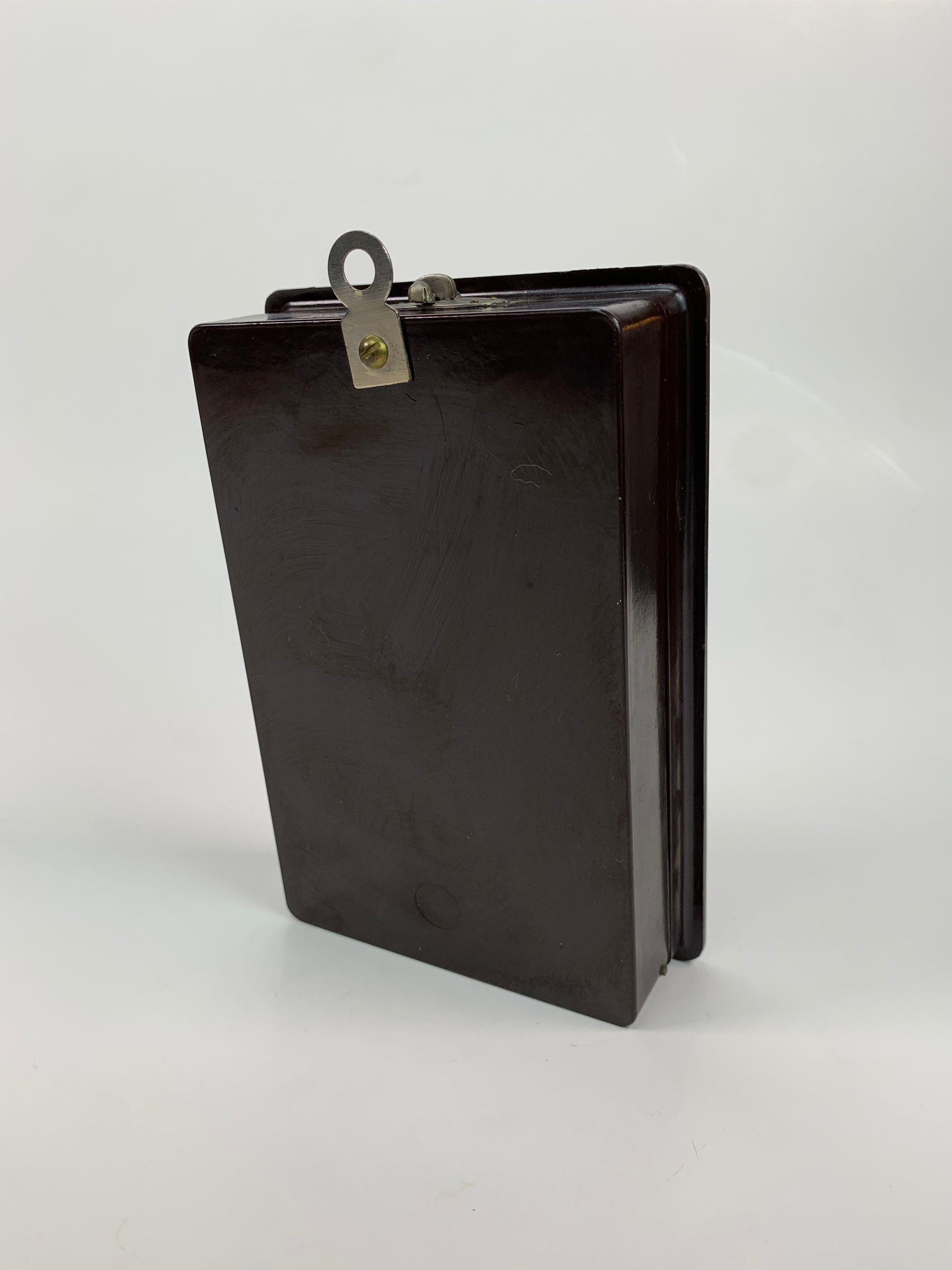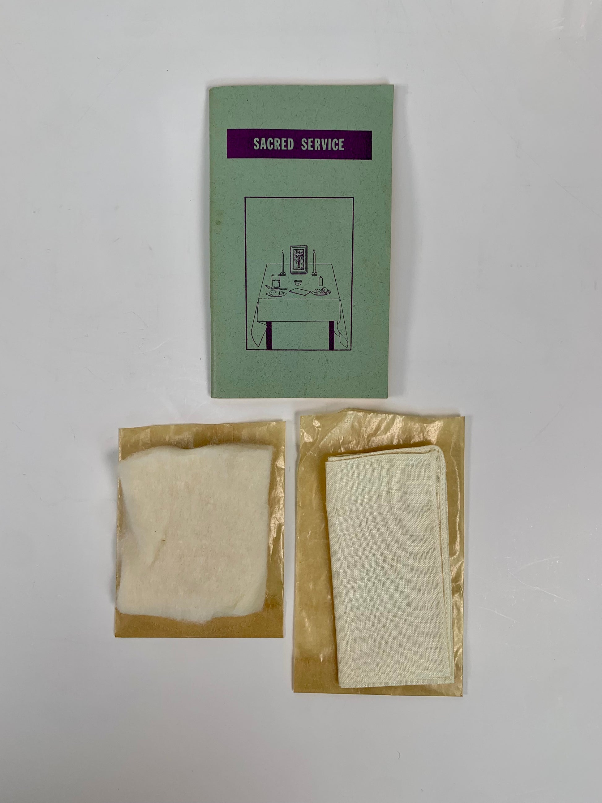 This vintage Religio portable Last Rites Sick Call Kit is a compact, functional piece designed for administering final rites. The kit contains essential items in performing the sacred service - two half burnt altar candles, a holy cross, a holy water bottle, sacred service pamphlet, and two wax paper envelopes container cotton and napkins. Kit case has a hanger on the back for easy grab and go storage.