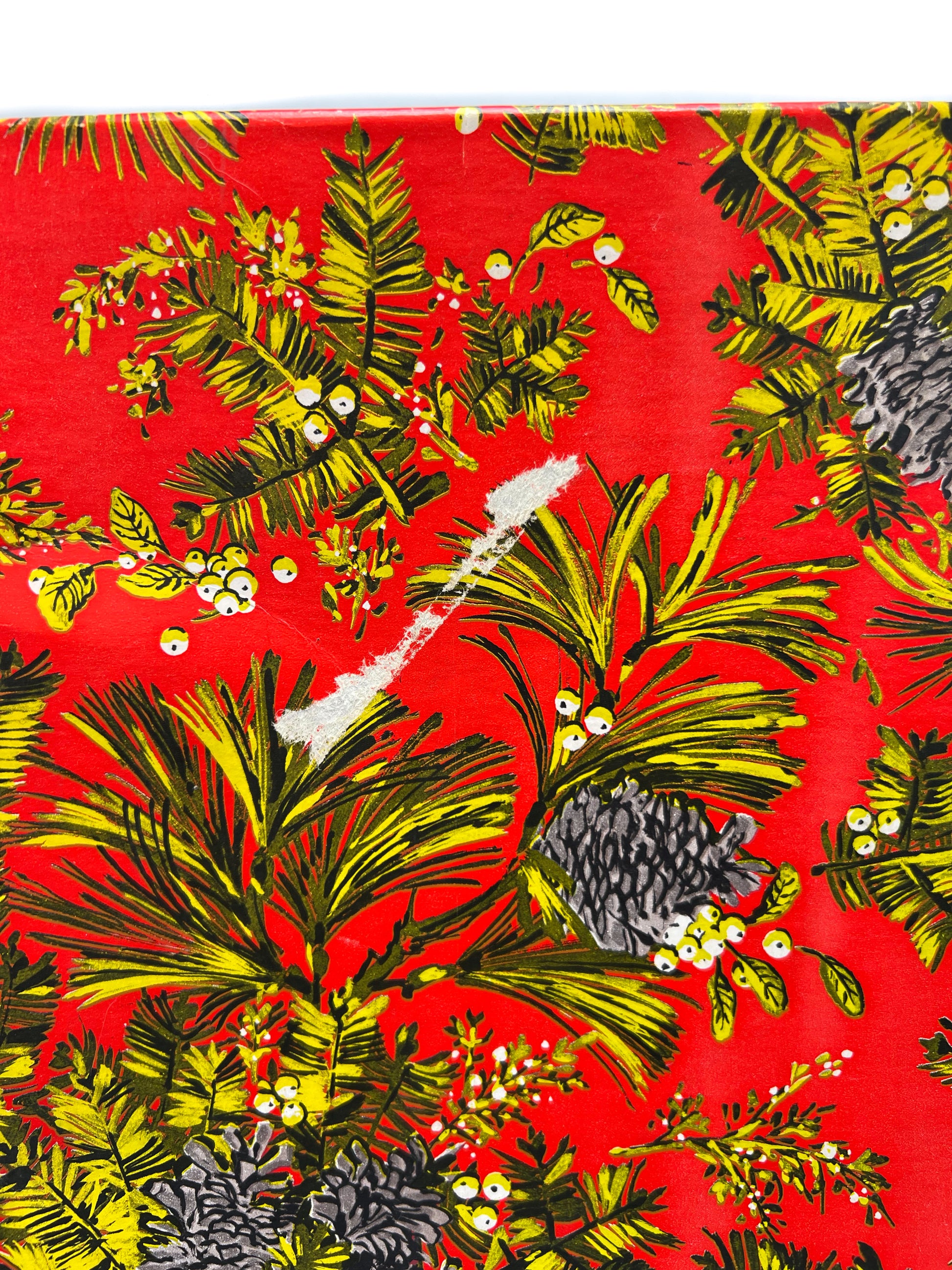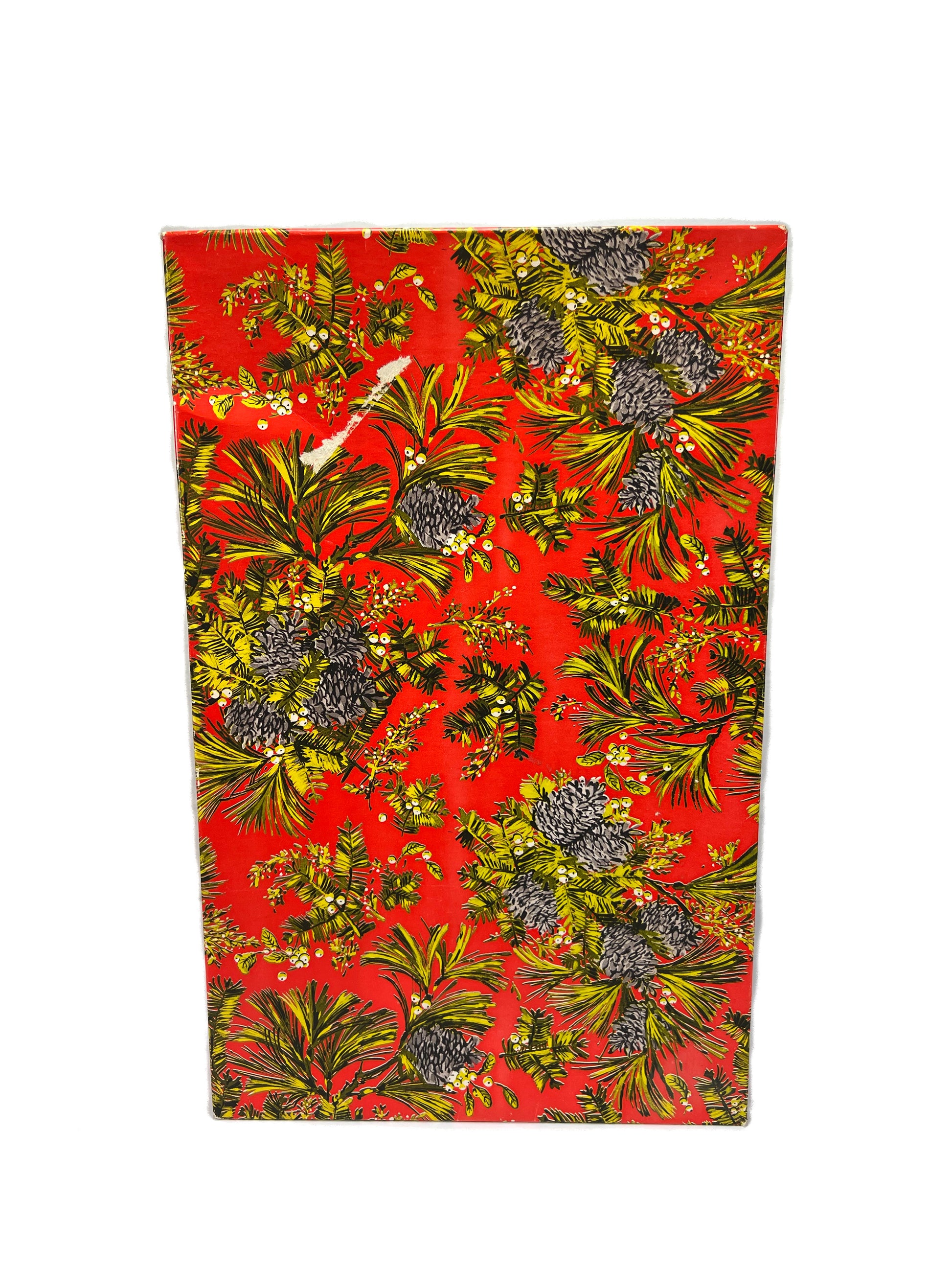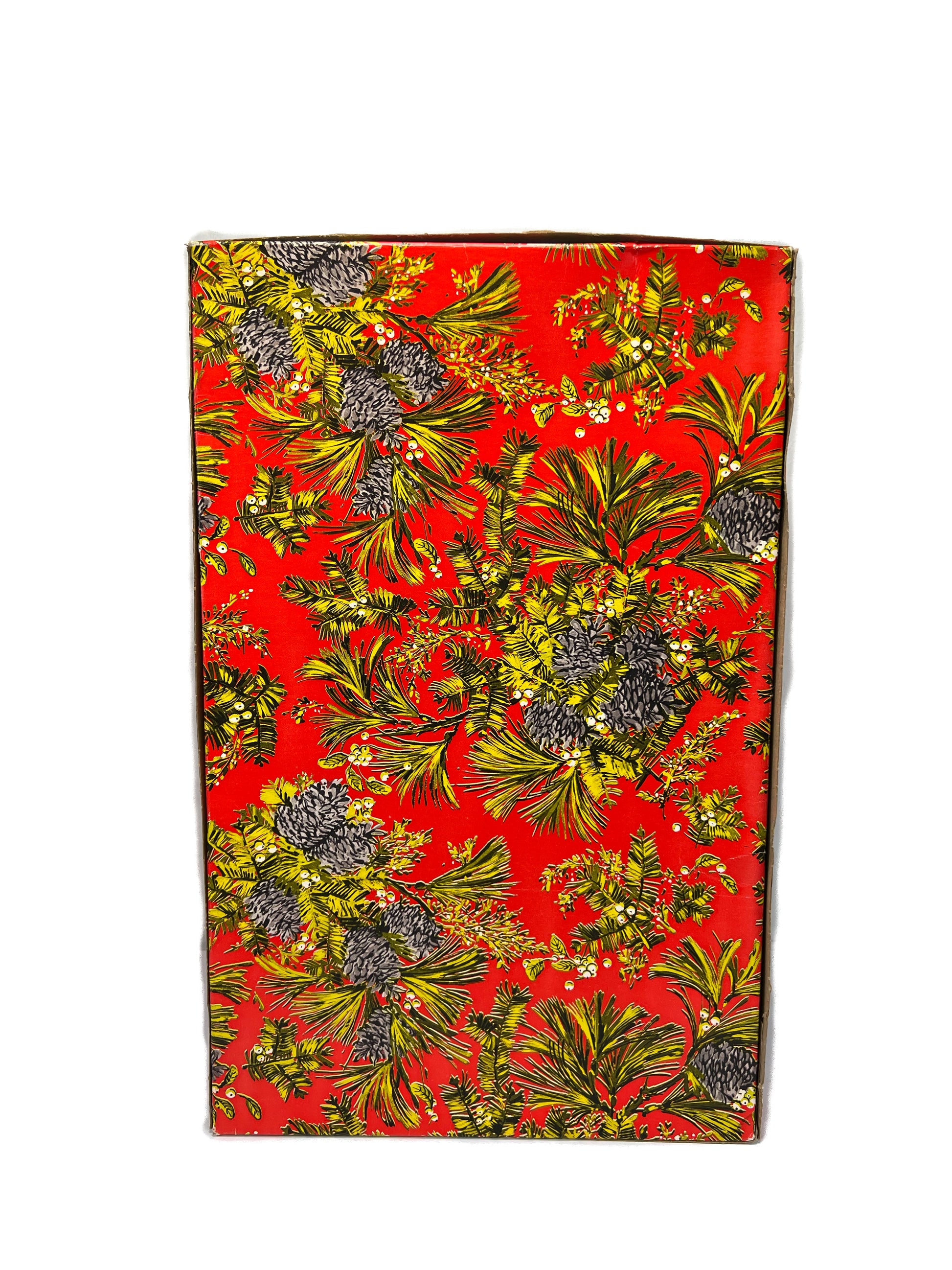 Rare retail box with illustrated pine cone clusters on the branch over a fiery persimmon orange background. A perfect piece for any mid-century decor lover!