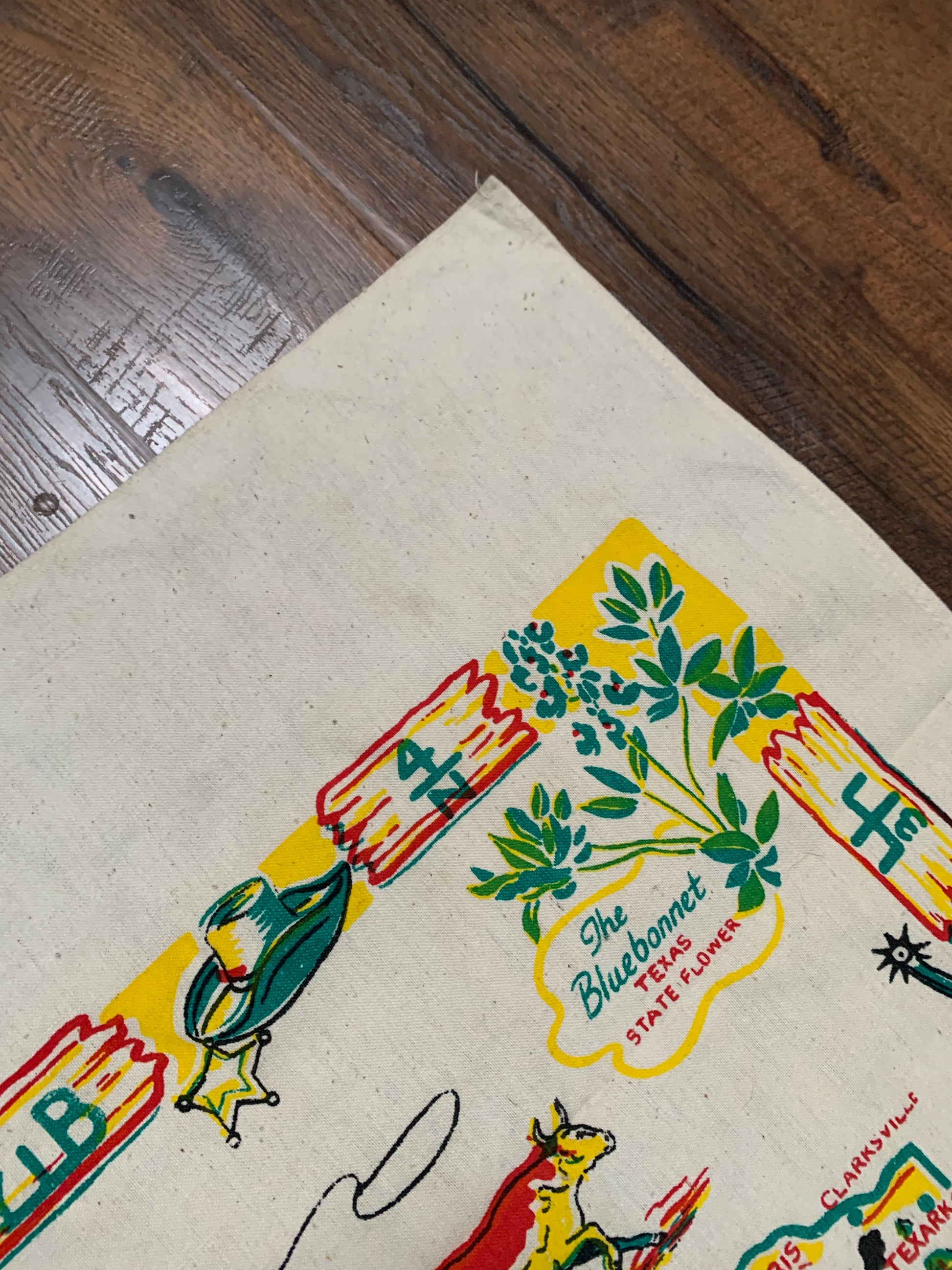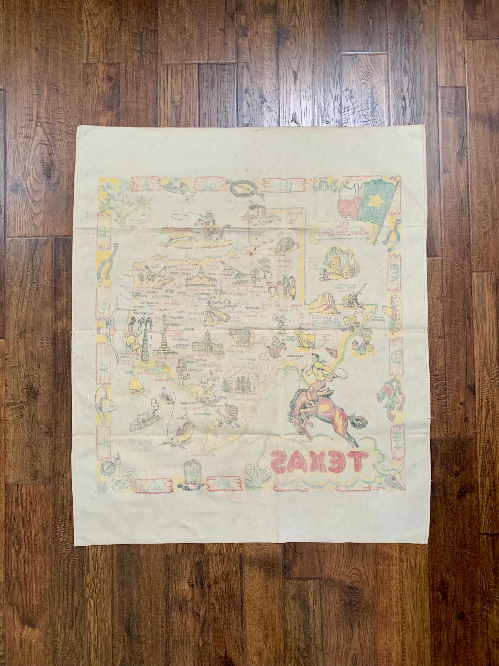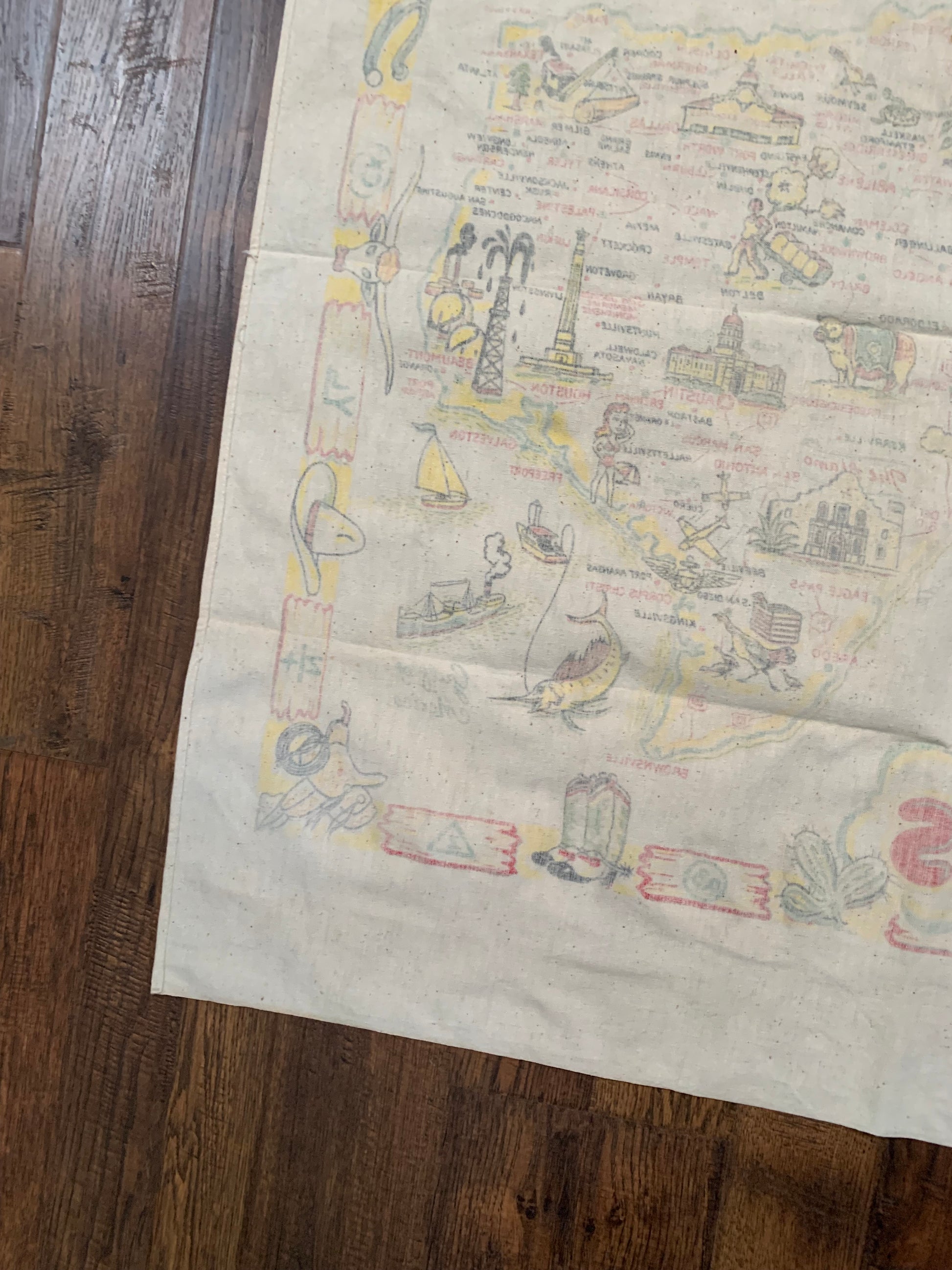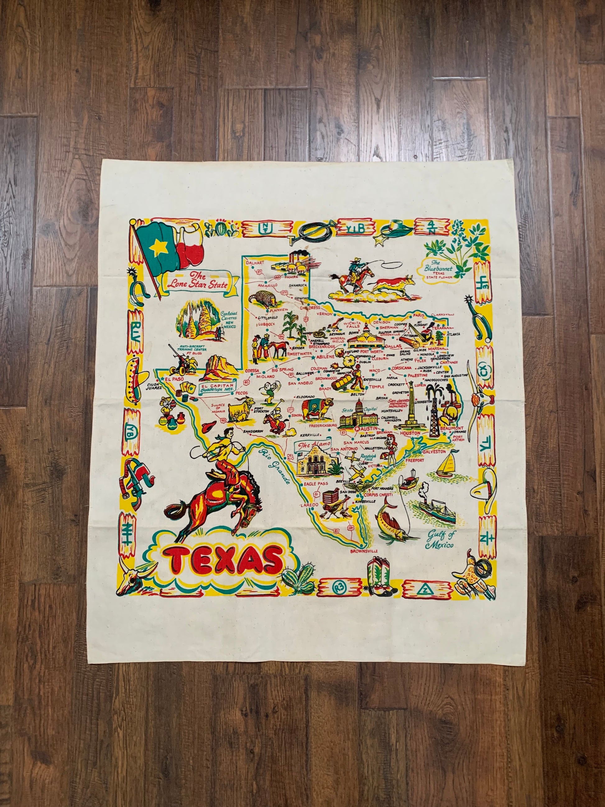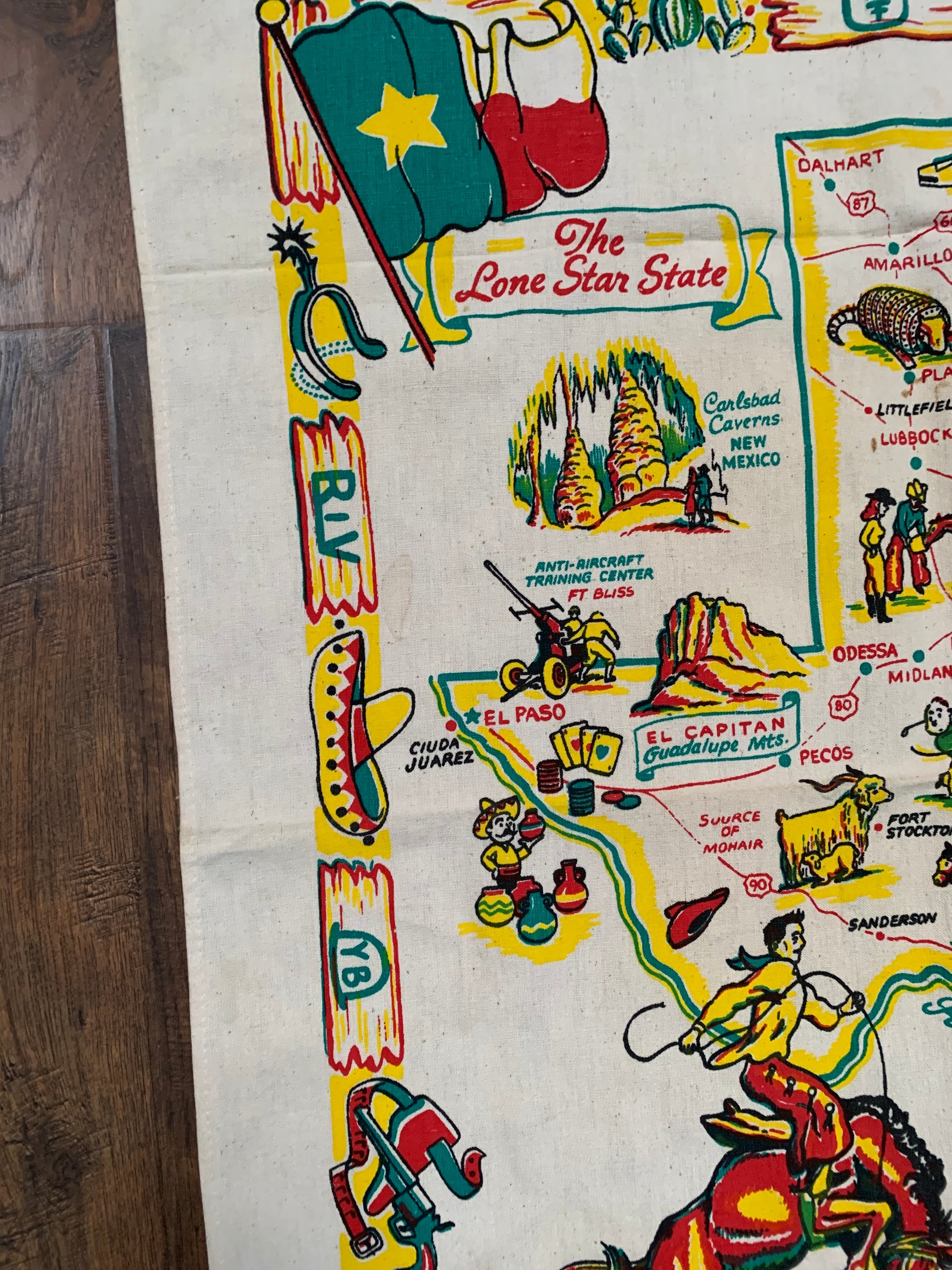 Vintage Souvenir - Wall Hanging Linen Tablecloth - Texas State Map - 1950s