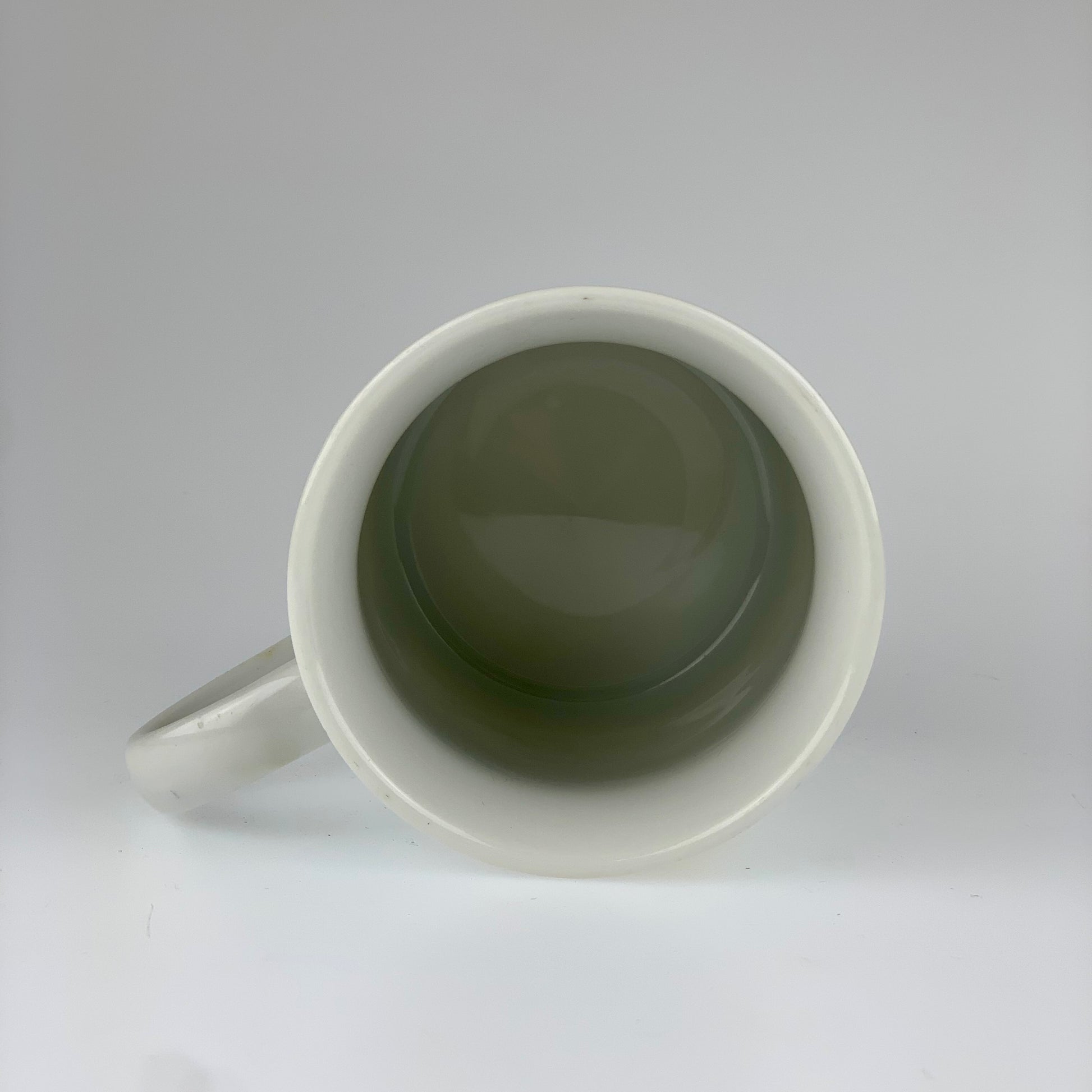 Measures 3 1/2" tall, 3" wide at mouth. Minor flea bite chips on the bottom of the mug.