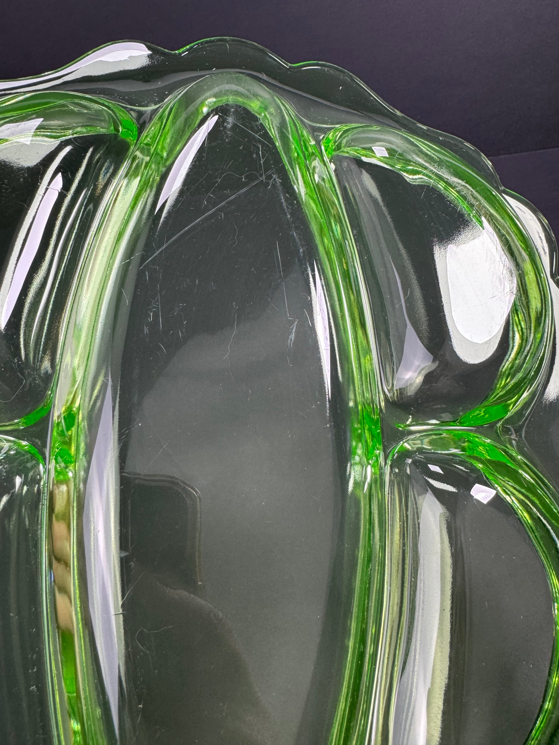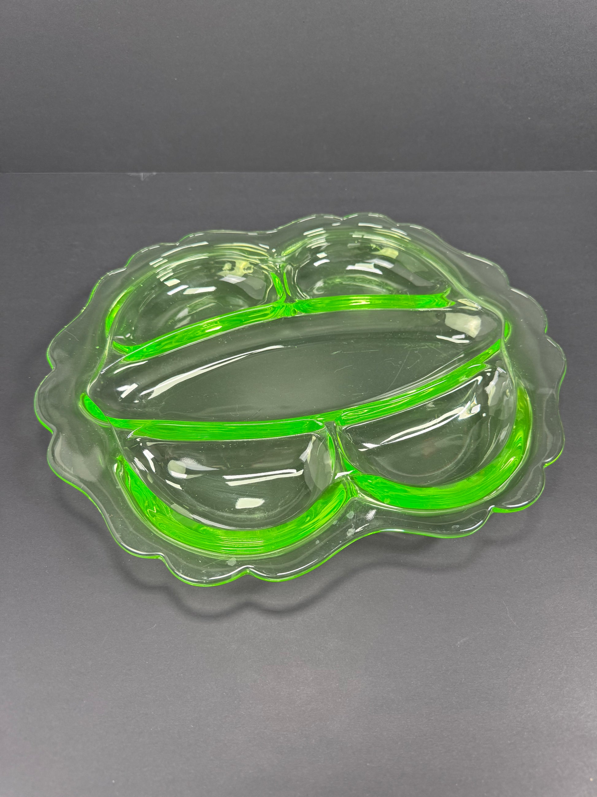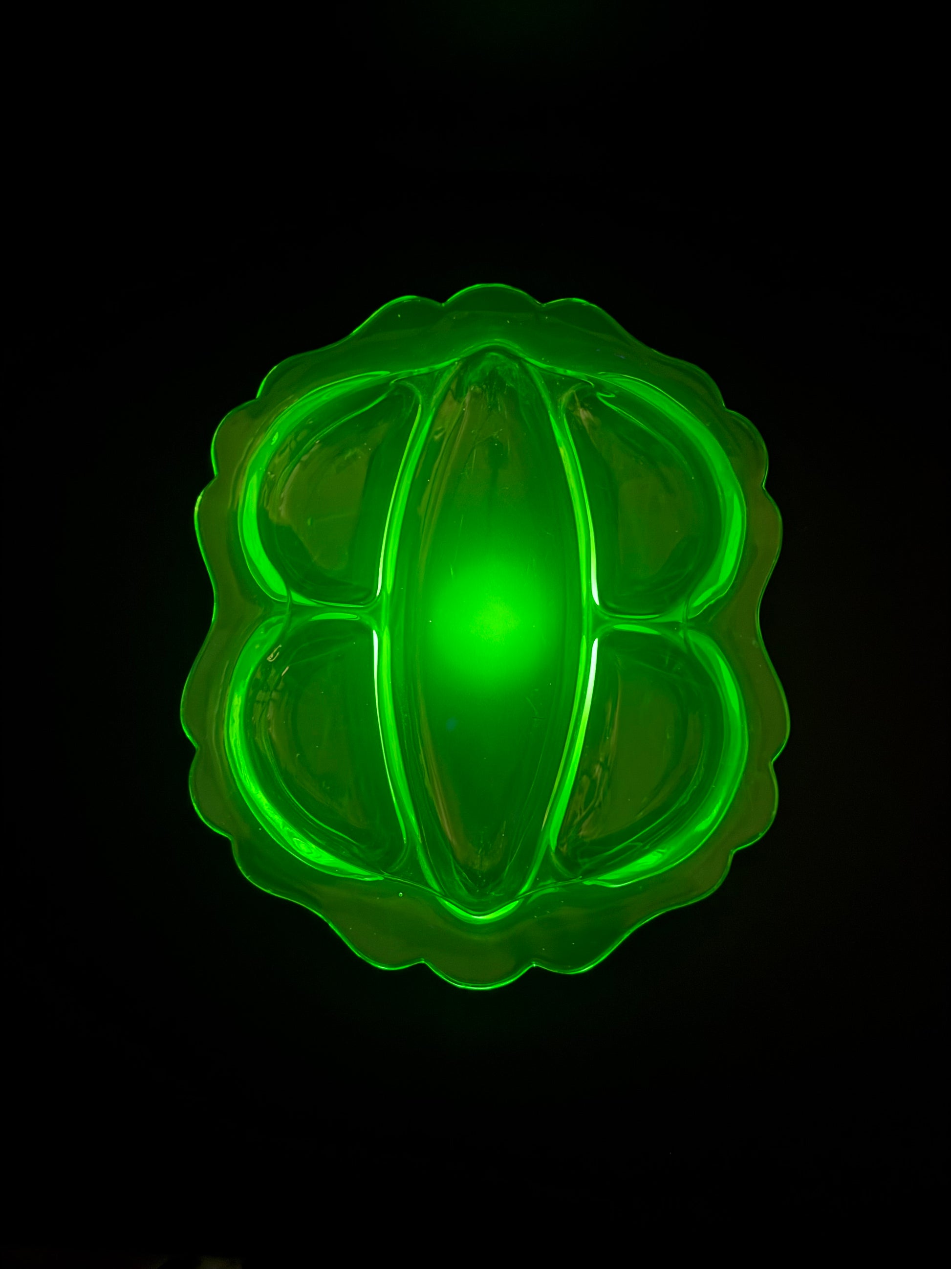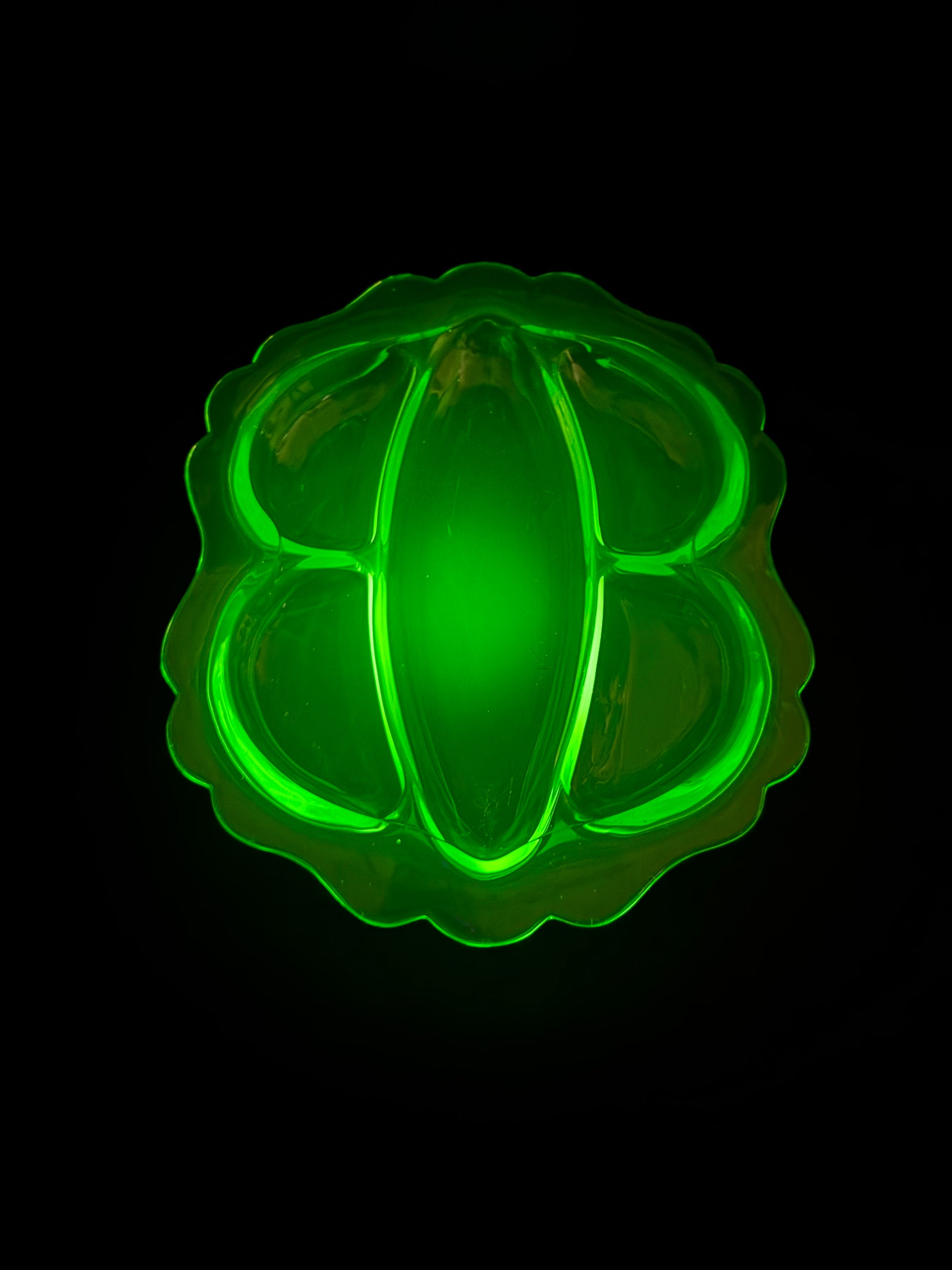 This elegant Uranium glass condiment dish showcases timeless craftsmanship. With 5 impressions for storage - we love using these as valets! A stunning addition for collectors, it embodies the artistry and grace of early 20th-century glassware.