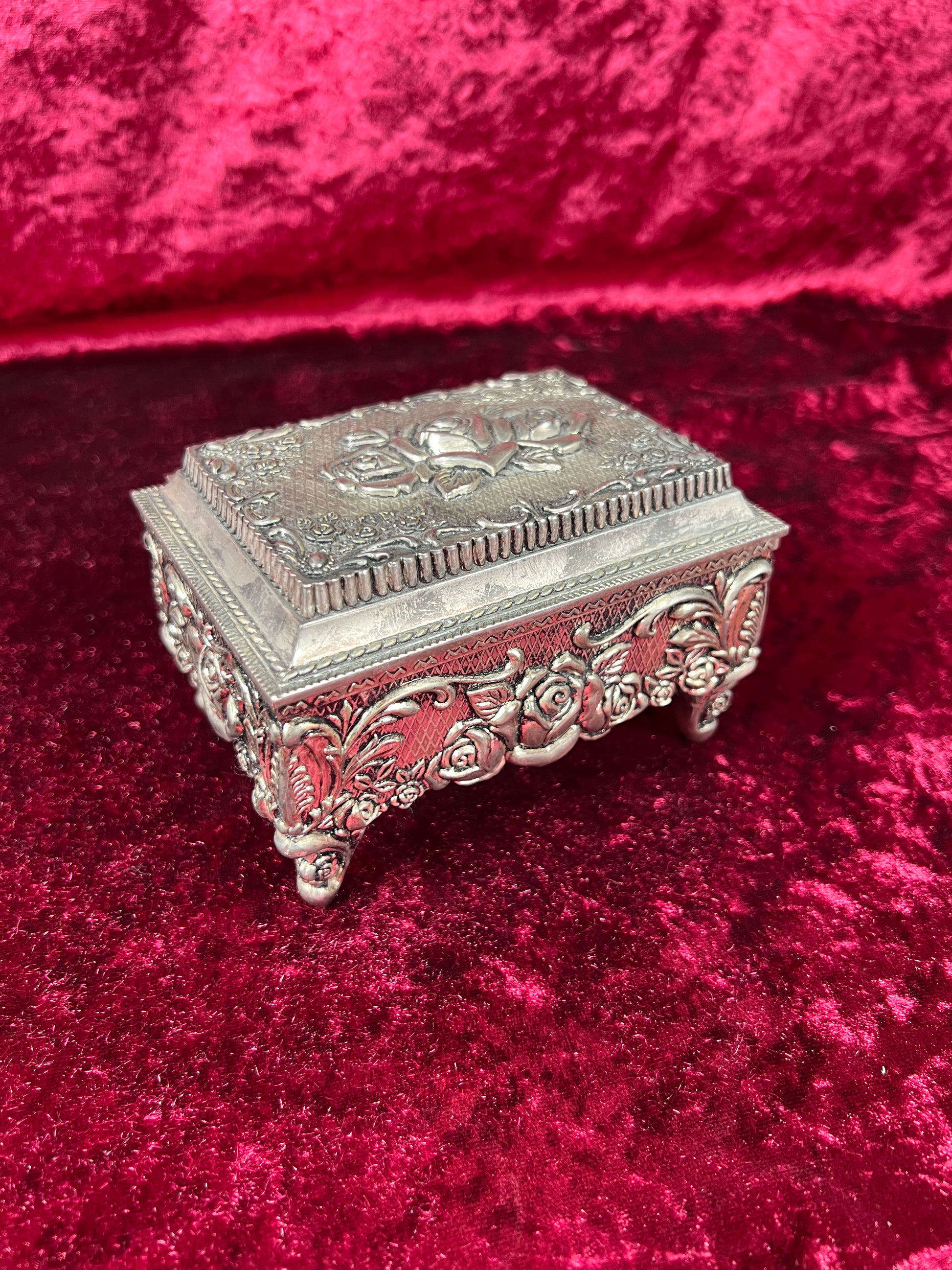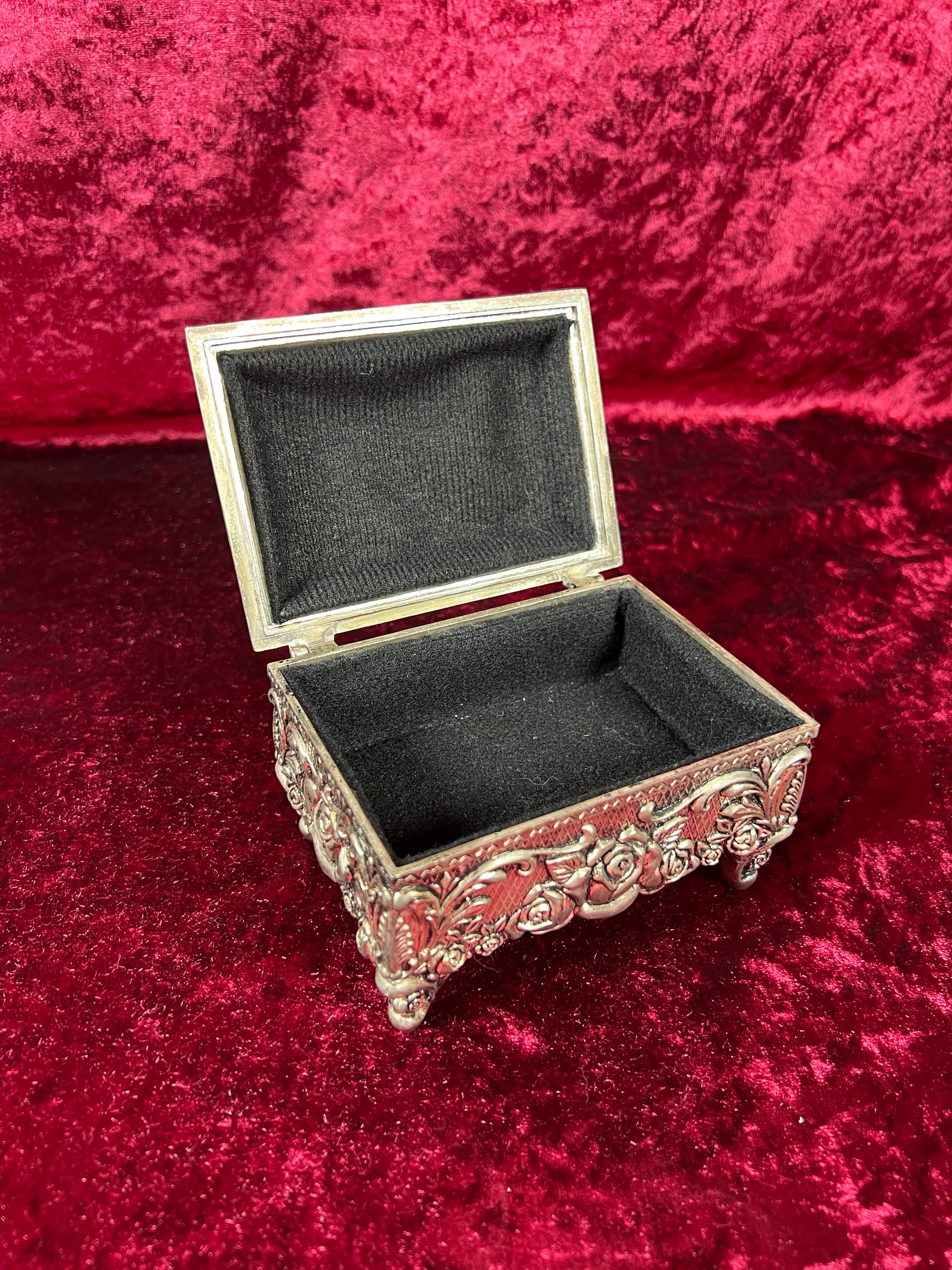 Vintage Vanity - Jewelry Box - Ornate Silver Rose Filigree - Black Velvet Lining - Footed