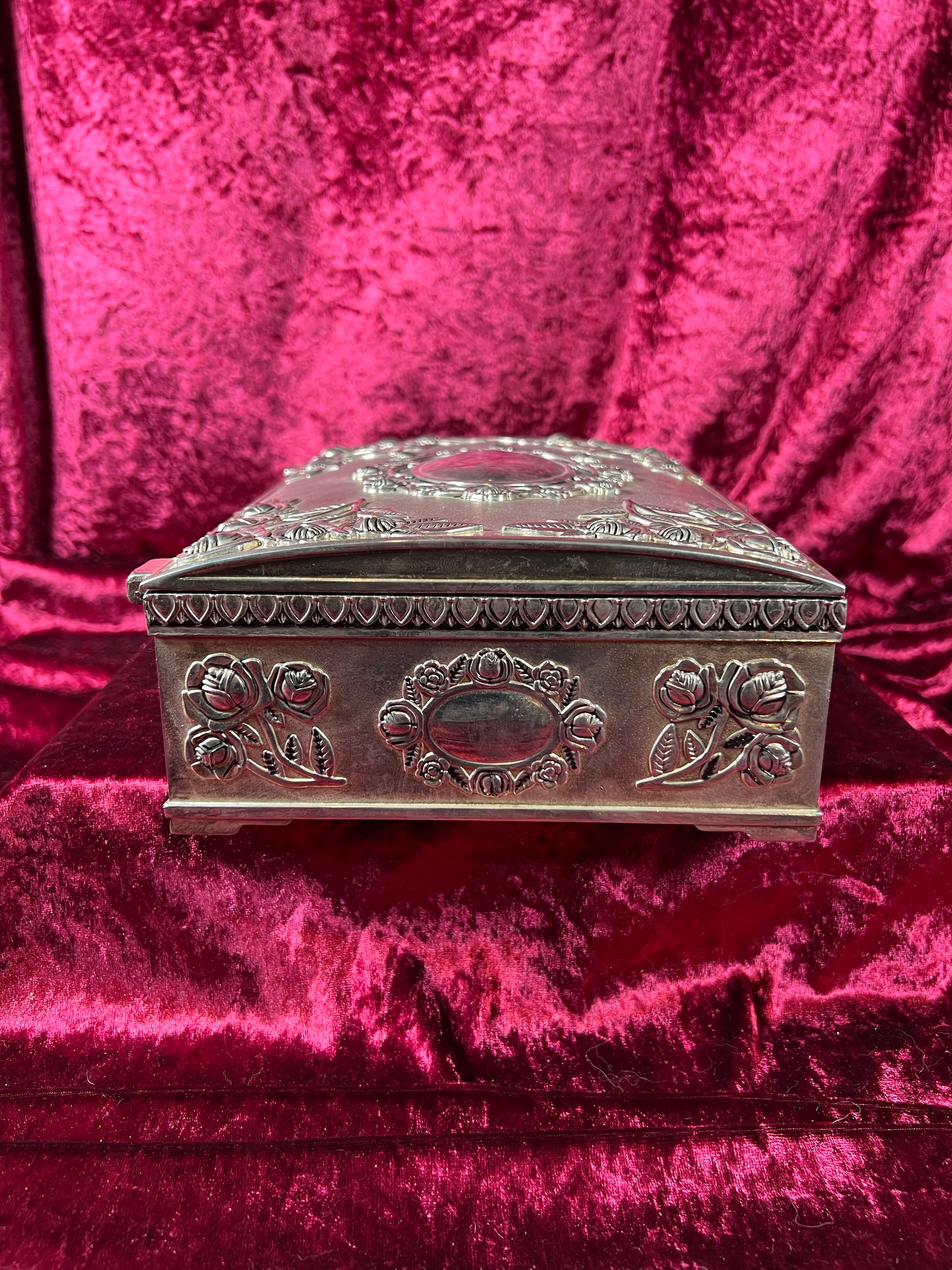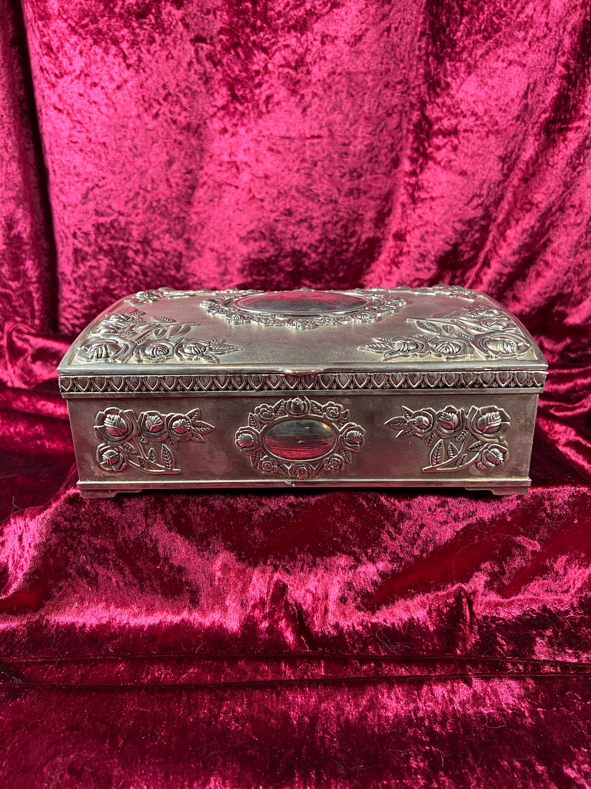 Vintage Vanity - Large Jewelry Box - Ornate Silver Rose Filigree - Red Felt Lining