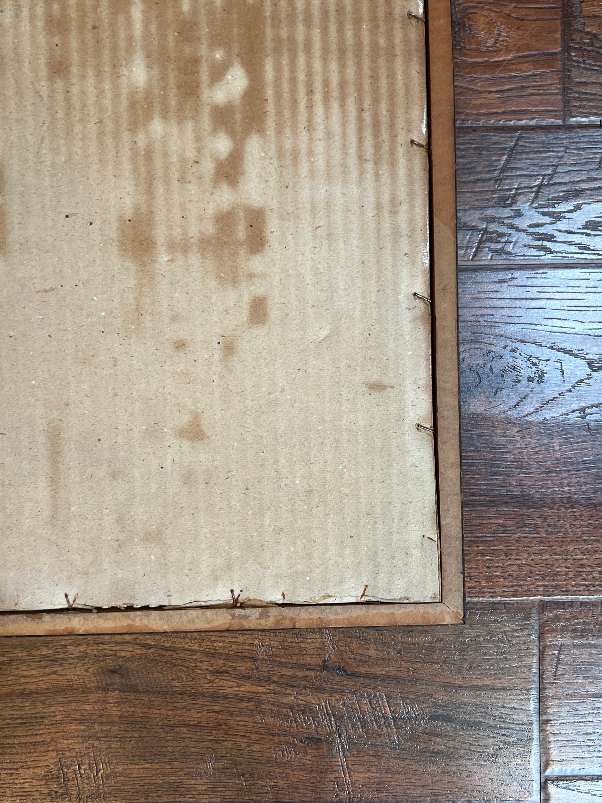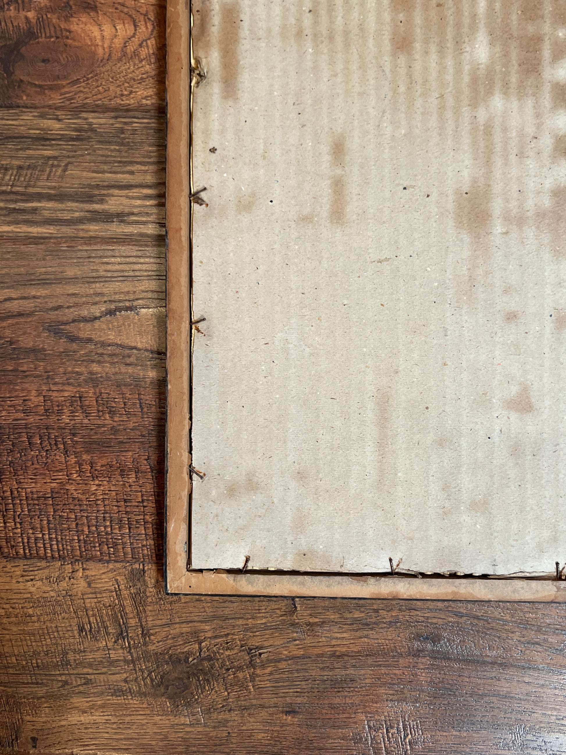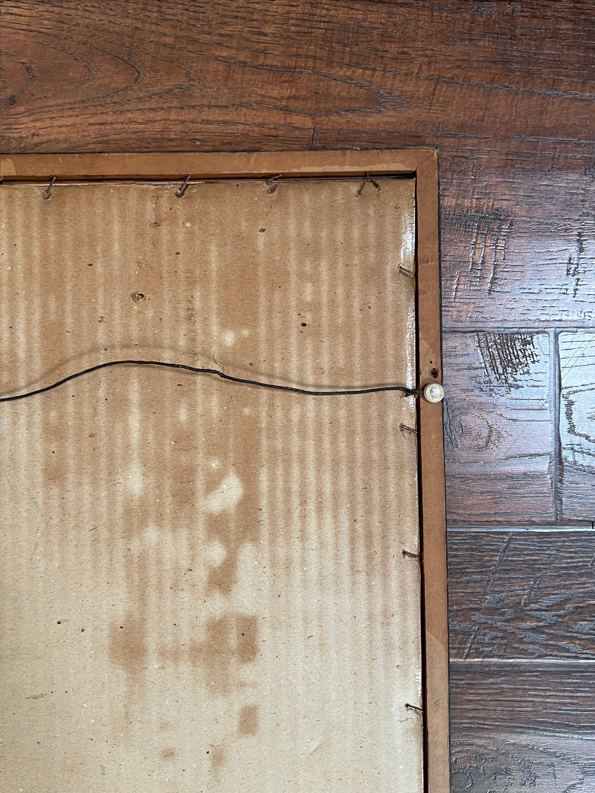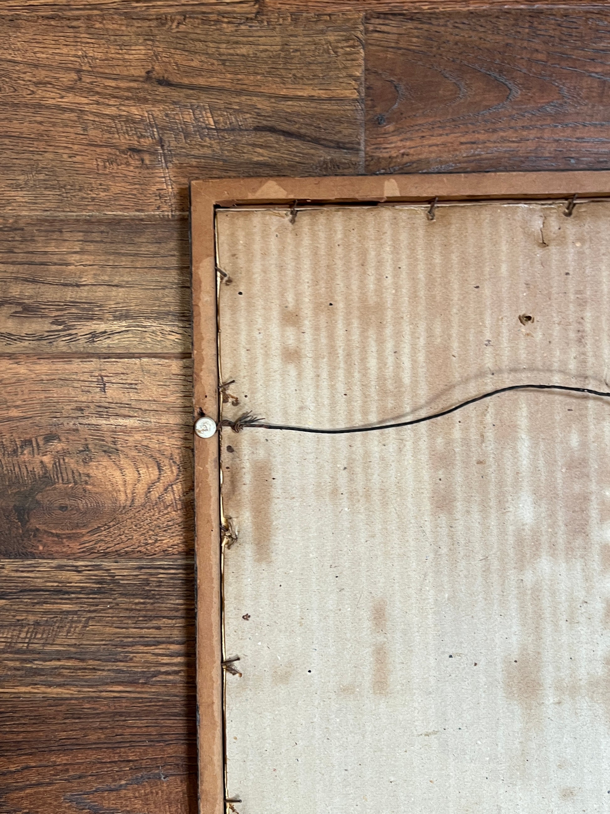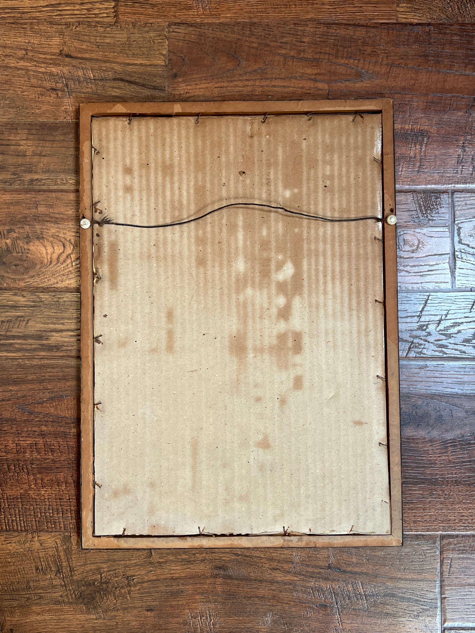 Condition: Black paint on the frame is worn all over, and there is some tea colored staining on the print itself. Glass is not cracked or chipped, see pictures.
