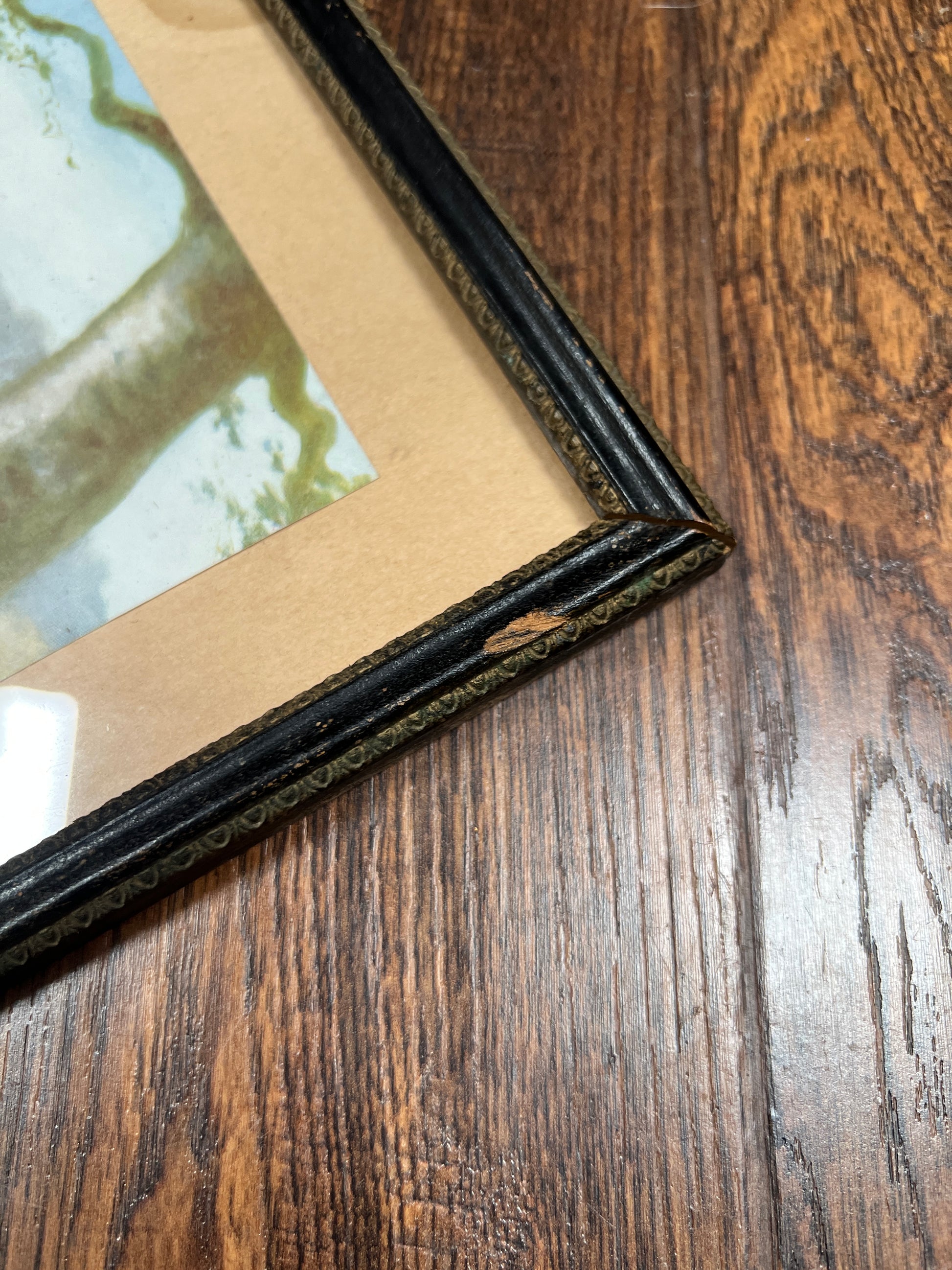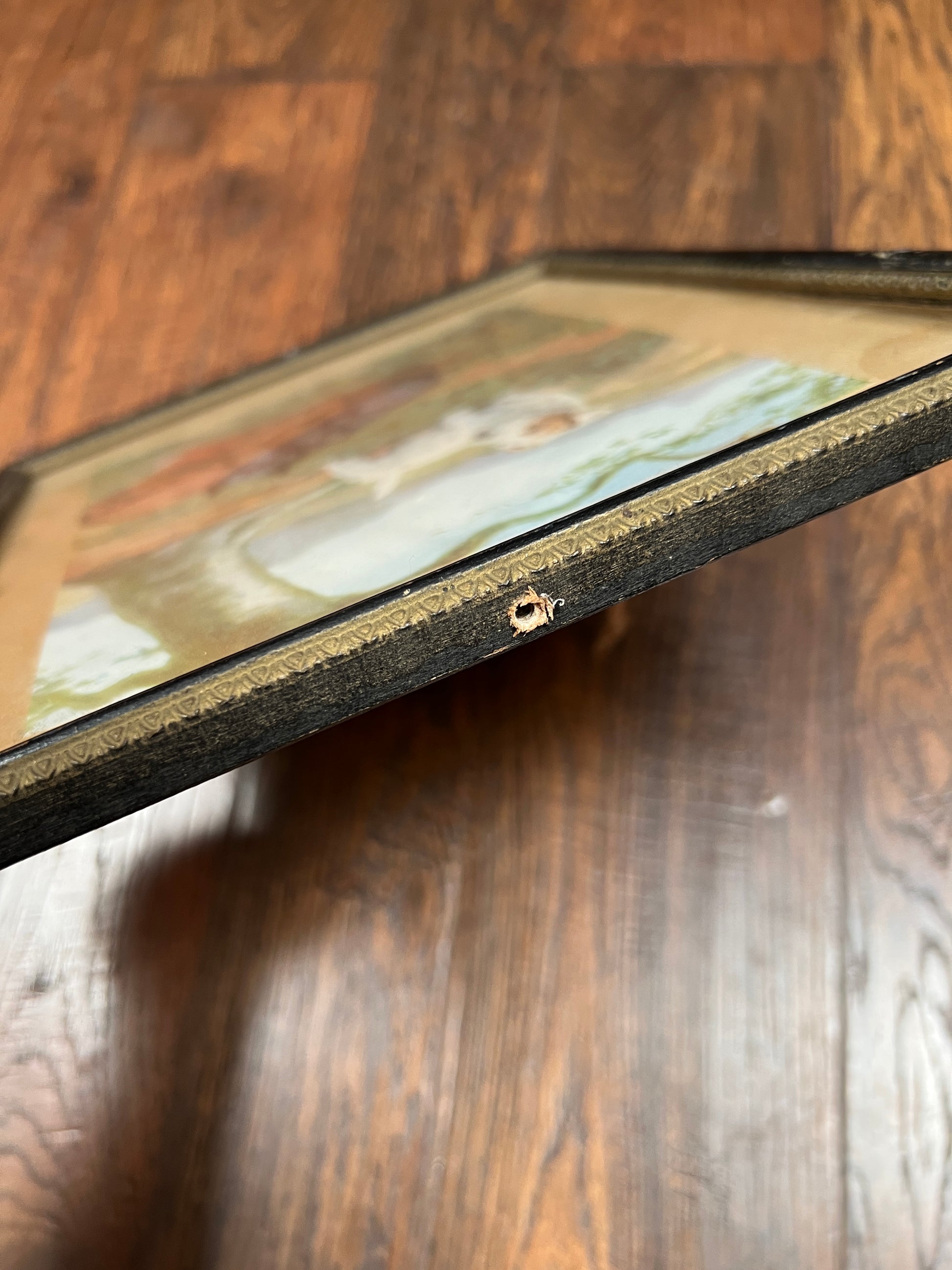 Condition: Frame has a hole on the top and wear to the paint on the edges and corners. Glass is intact. See pictures.