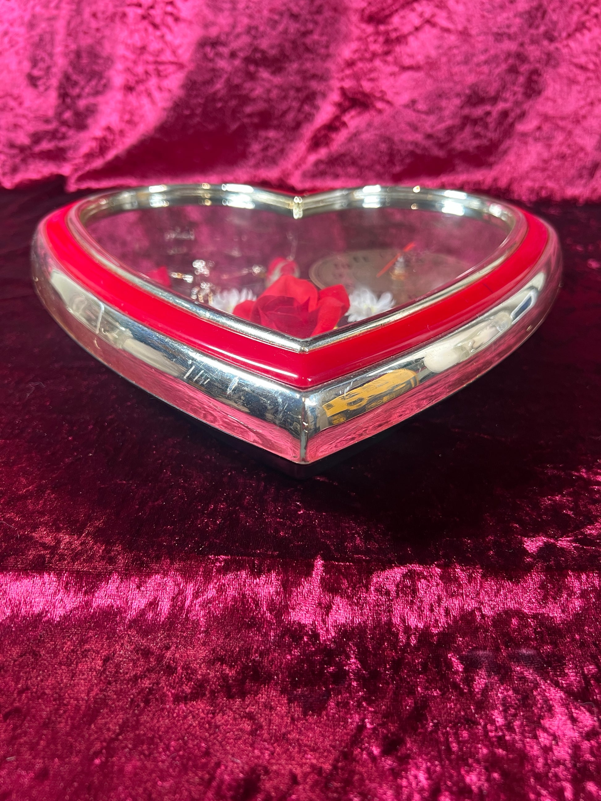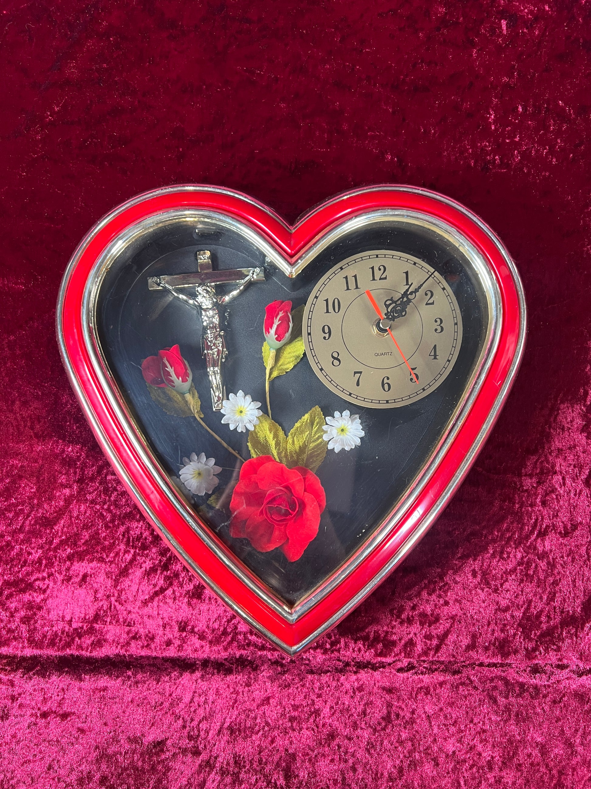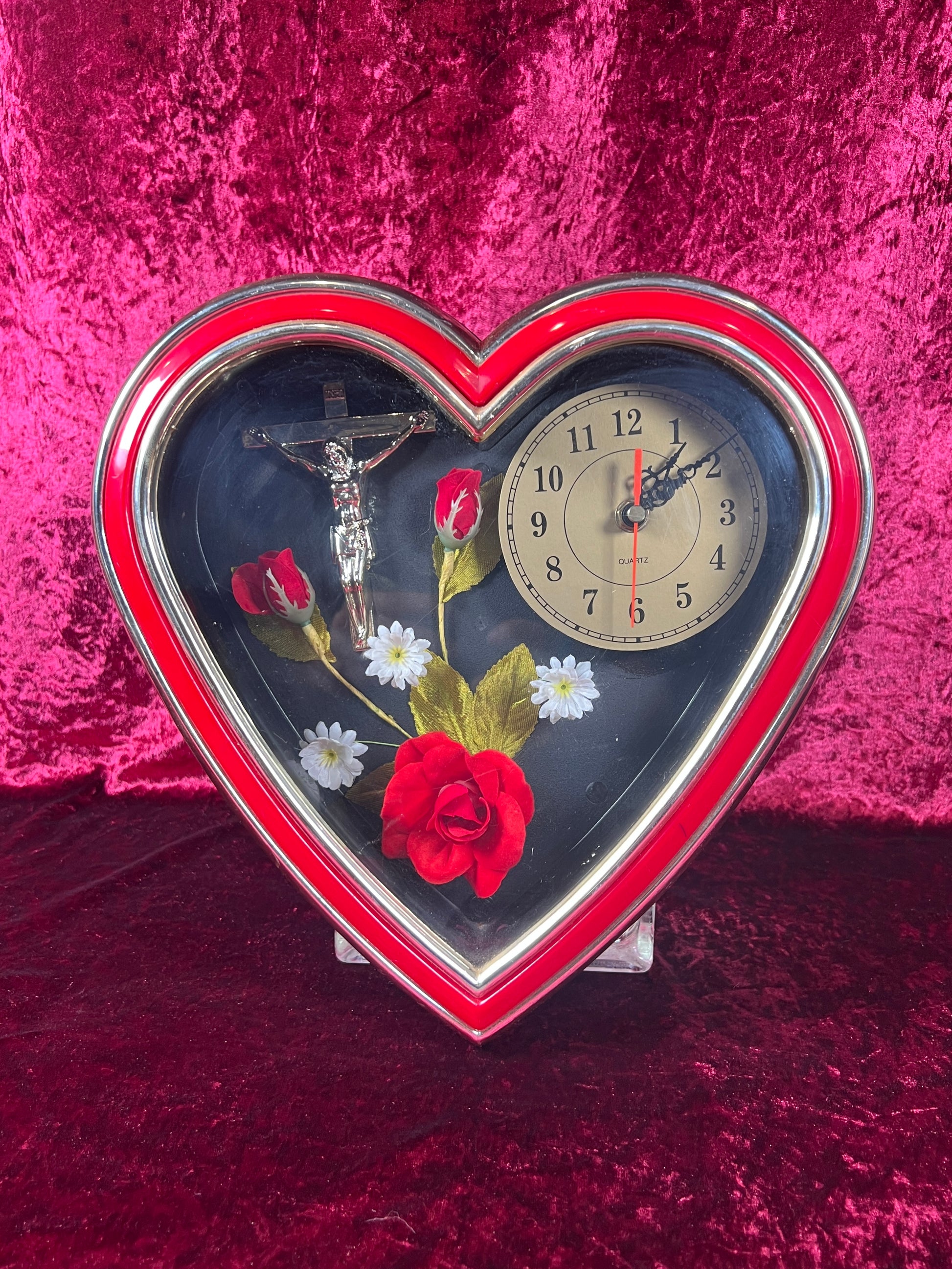 Vintage Wall Clock - Red Heart Shaped Shadow Box - Crucifix and Roses